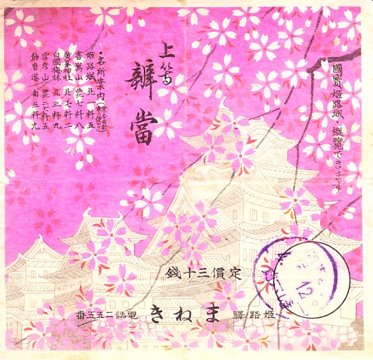 1929(昭和4)年4月12日の調製と思われる、昔の姫路駅弁の掛紙。これは姫路城を桜花で覆う、季節の絵柄だろうか。