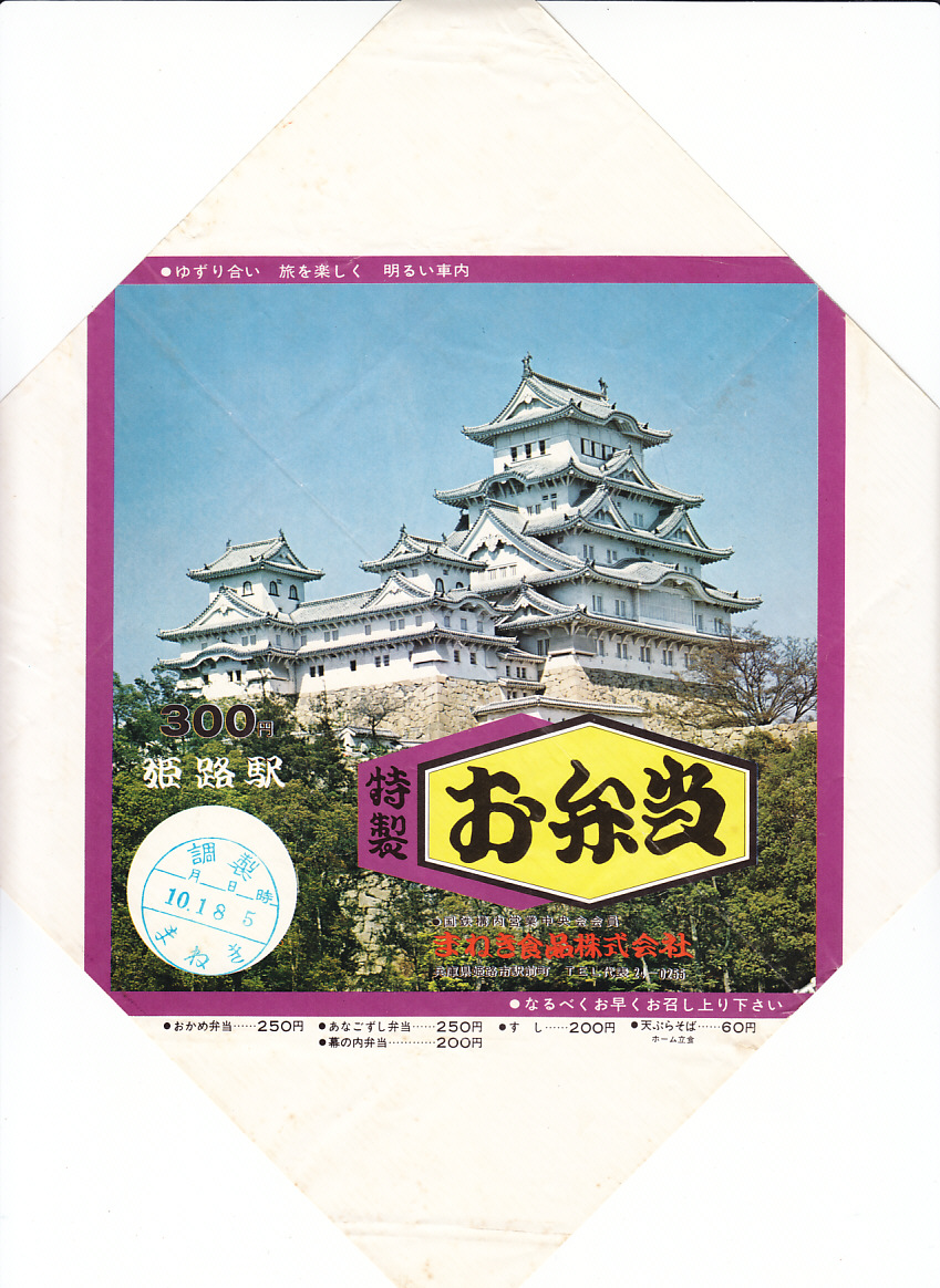 昭和40年代、1970年前後の、10月8日7時の調製と思われる、昔の姫路駅弁の掛紙。写真は当然、姫路が誇る国宝姫路城。空の塗り分けのミスマッチさに時代を感じさせる。