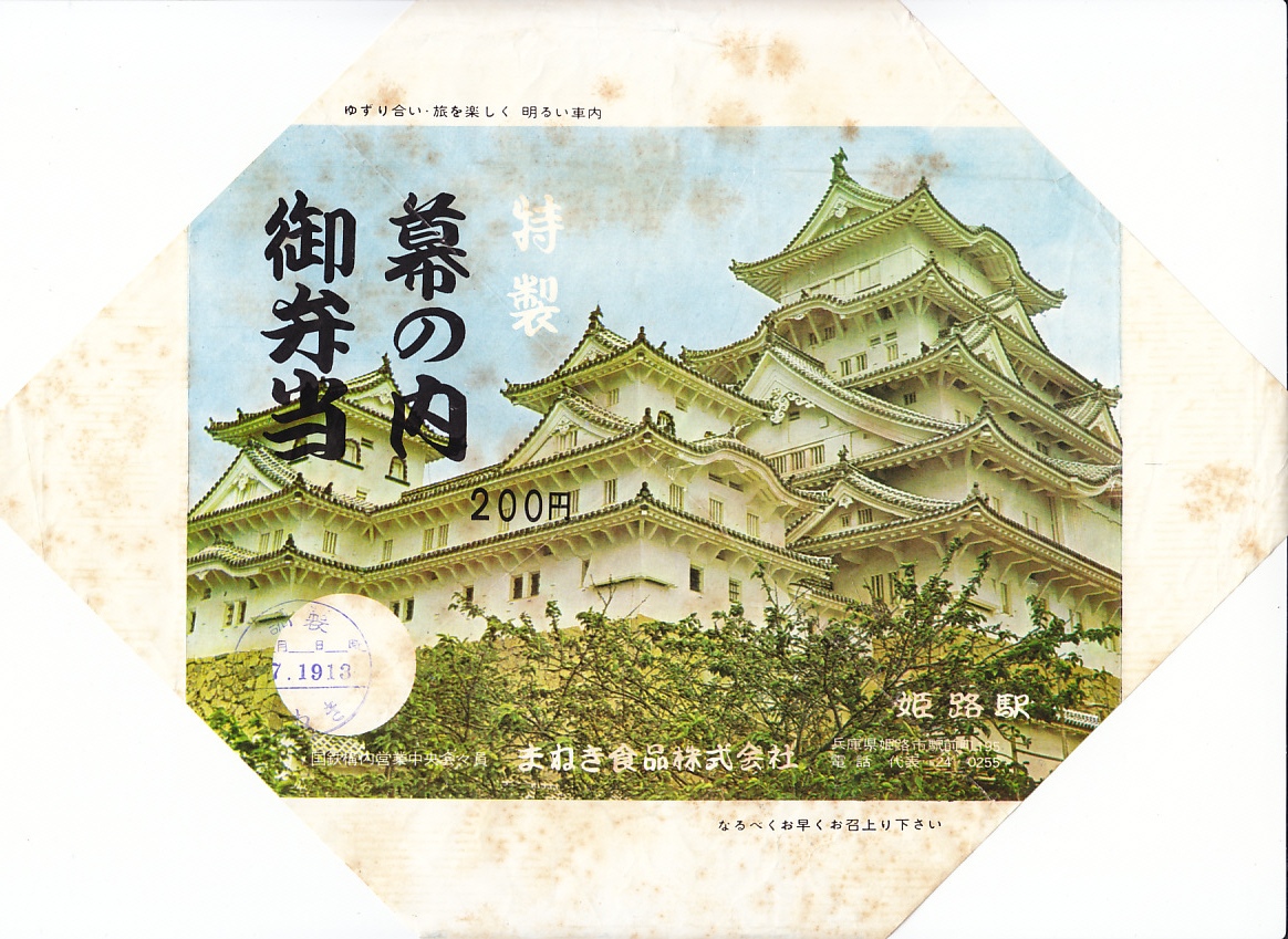 昭和40年代 1970年前後の、7月19日13時の調製と思われる、昔の姫路駅弁の掛紙。掛紙が汚れてしまっているが、写真はやっぱり姫路城。撮る位置や見る位置も、どれもだいたい同じ感じ。