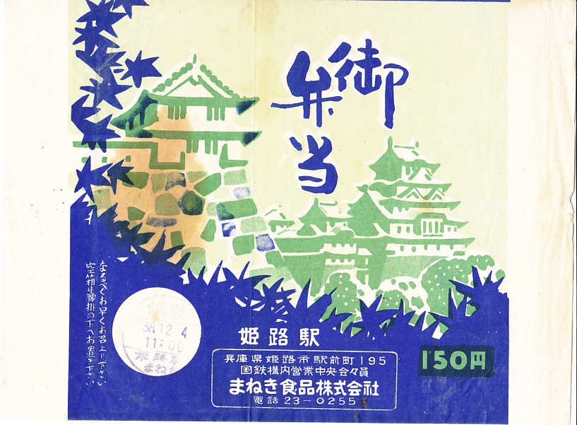 1963(昭和38)年12月4日11時の調製と思われる、昔の姫路駅弁の掛紙。第二次大戦前や昭和時代の姫路駅弁の多くが姫路城を描き、これもそのとおりであるが、大天守と小天守の手前にカの櫓とその石垣を置く、他にない構図でできている。