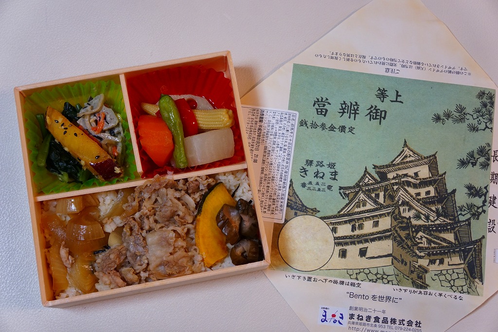 2017(平成29)年1月の京王百貨店の駅弁大会で売られた、掛紙復刻弁当。かつて姫路駅の上等幕の内駅弁で使われた掛紙を使用、福井県の駅弁催事業者のロゴマークとキャッチフレーズも記される。中身は茶飯を牛肉とカボチャとタマネギと柴漬けで覆い、ダイコンやニンジンなどの煮物と、小松菜やレンコンなどの和え物を詰める。食品表示ラベル上で品名が「但馬牛と十品目の野菜弁当」とあり、そんな名前とこんな内容のものが2014年の秋頃から駅弁催事専用商品としてあるらしい。容器と中身は貧弱。掛紙の姫路城は見事。価格は2017年の購入時で950円、「但馬牛と十品目の野菜弁当」は2019年時点で980円、2020年時点で1,000円、2023年時点で1,080円。