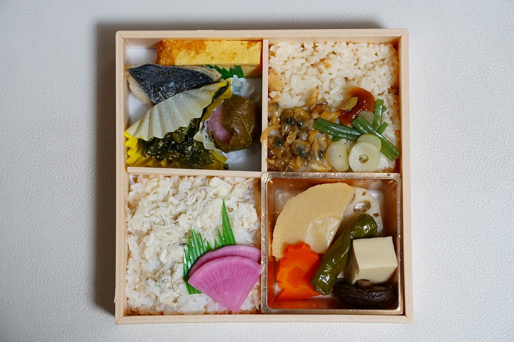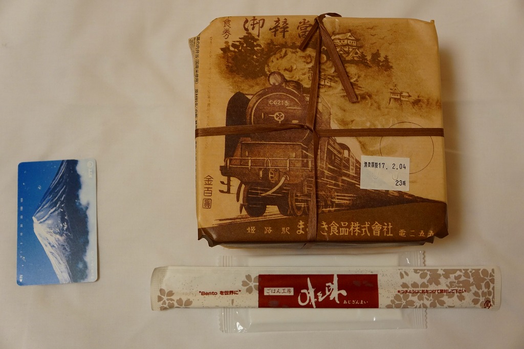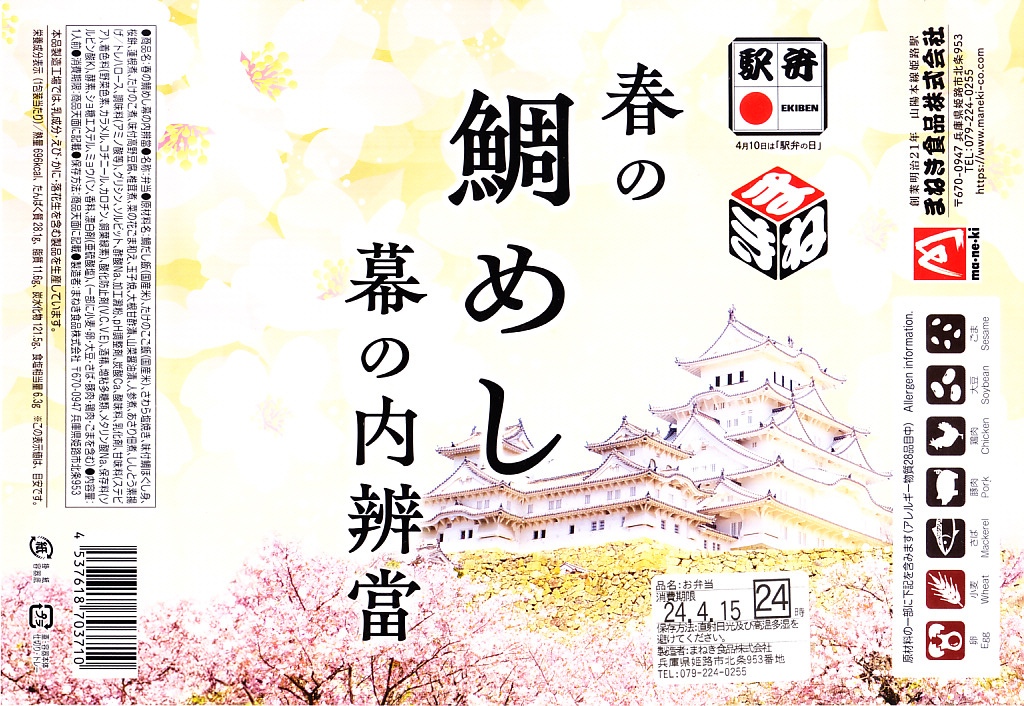2024(令和6)年4月5日から5月5日まで、姫路、新神戸、大阪、新大阪、京都駅などで販売。駅弁の日に合わせ、日本鉄道構内営業中央会の会員のうち31社が各社おすすめ駅弁に共通ノベルティ「千社札風カード」を添付して期間限定で販売した駅弁の、姫路駅バージョン。姫路城と桜を描いた掛紙をまとう、松花堂弁当タイプの容器に、瀬戸内産真鯛の鯛めし、たけのこご飯、タケノコや姫路城型ニンジンなどの煮物、焼サワラに玉子焼と菜の花ごま和えに桜餅を詰める。おかずの多い、柔らかな鯛飯駅弁。「幕の内」の要素を感じられないが、これは姫路駅が幕の内駅弁の元祖であることを言いたい記念駅弁なのかもしれない。