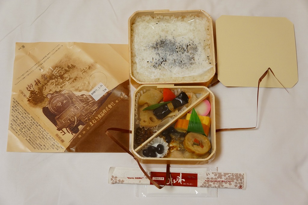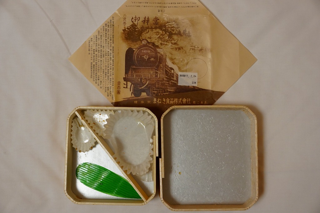 姫路駅でイベント時にときどき販売される復刻駅弁。正方形二段重ねの松製経木折に、かなり昔の駅弁掛紙デザインを取り入れた薄手の掛紙をかけて、ひもで十字にしばる。中身は下段がプレーンな白御飯、上段が鯛塩焼、伊達巻、きんとん、玉子焼、焼蒲鉾、百合根、空豆、大豆昆布、フキ、ごぼうと奈良漬や梅干など。今の駅弁にないおかずの組み合わせに、御料理弁当以上、おせち料理以下の風味と雰囲気を感じる。