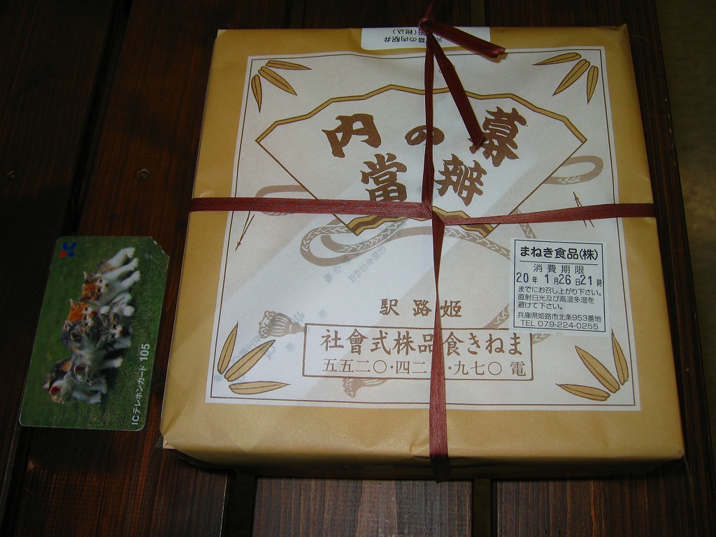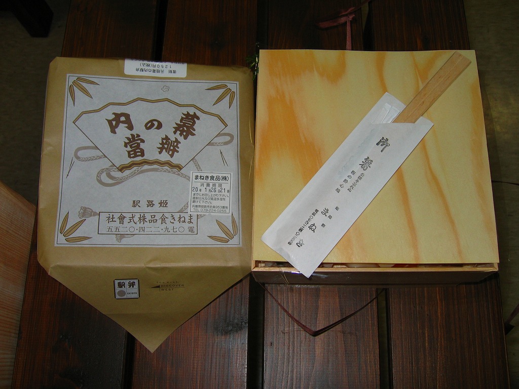姫路駅の幕の内弁当。JR西日本の駅弁キャンペーン「駅弁の達人」の実施に伴い、2004(平成16)年5月1日に発売したとされるが、下記のとおり姫路駅の幕の内弁当は、100年以上前から売られるものである。市販の汎用品に見えて調製元の専用品である紙箱には、商品名と姫路城、簡単なおしながきに駅弁マークとJR西日本のDISCOVERWESTロゴマークを描く。