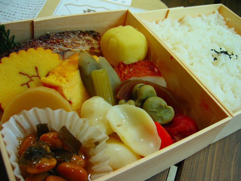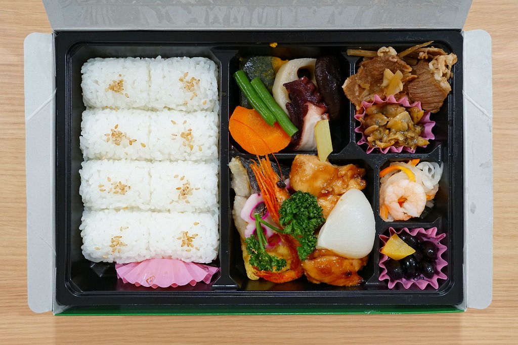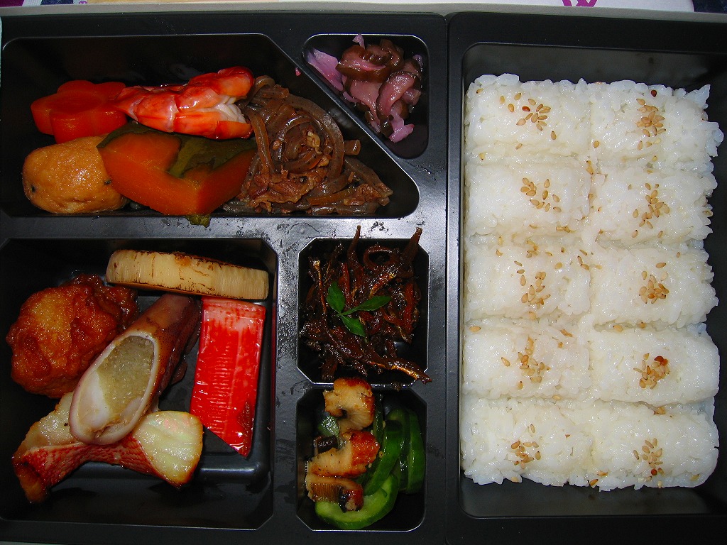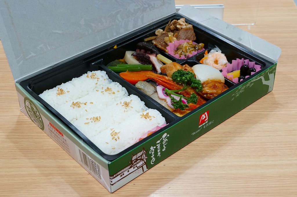 黒いプラ製トレーに収めた中身は、白ごまの俵飯とたくあん、瀬戸内産真蛸のやわらか煮と姫路蓮根その他の煮物、兵庫県産黒豆、淡路産焼玉葱、サワラ西京焼、鶏もも照焼、玉子焼、牛肉とごぼうの煮物、エビの甘酢漬と大根なます、あさり佃煮、甘えび唐揚など。普段使いの幕の内駅弁、というジャンルのものは全国的にだいぶ少なくなったが、それよりはおかずが充実していると思う、お料理弁当。価格は2004年時点で1,000円、2014年時点で1,050円、2019年時点で1,080円、2022年時点で1,150円。