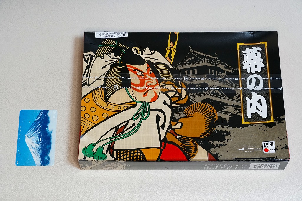 これは姫路駅の幕の内弁当か。商品名は「ご馳走幕の内弁当」とある。2013(平成25)年かその前から、新神戸駅や新大阪駅あるいは京都駅で売られるらしい。調製元が姫路駅の駅弁屋なのでここに収蔵するが、下記の姫路駅の幕の内駅弁「味づくし」と販売駅で使い分けるのかもしれない。専用のボール紙箱には姫路城に加えて浮世絵での歌舞伎役者のような絵柄もあり、まるで東京駅弁のよう。