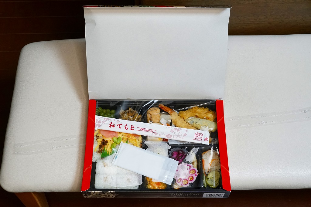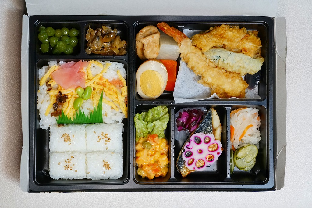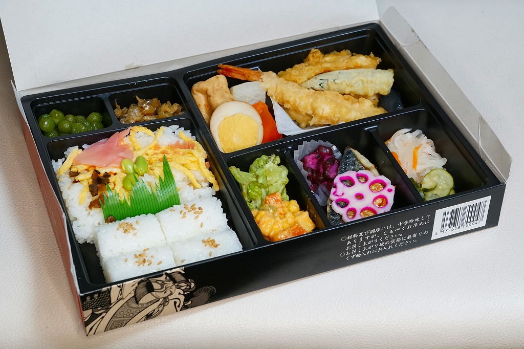 中身は俵飯とちらし寿司、玉子やがんもなどの煮物、海老、かぼちゃ、れんこん、かき揚げなどの天ぷら、さば塩焼き、大根なます、アサリ佃煮、うぐいす豆など。地域性はなくとも、おかずを少しひねった、機能的な幕の内弁当。