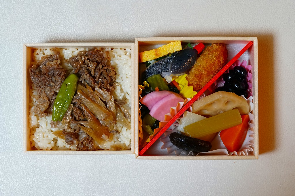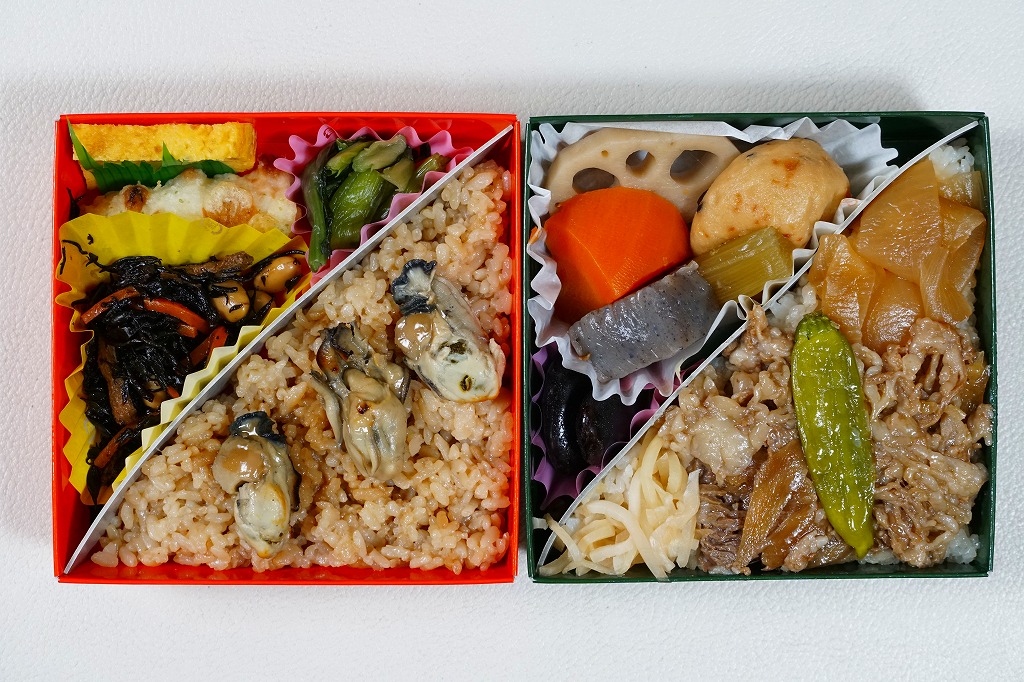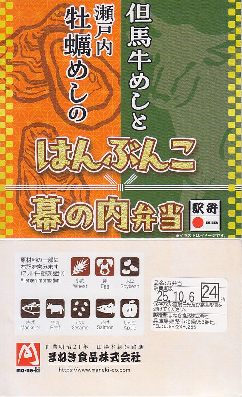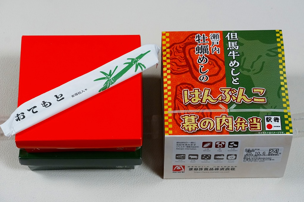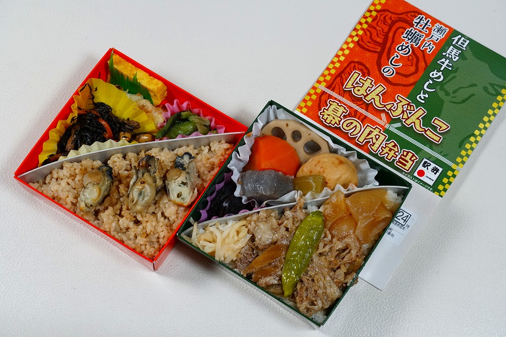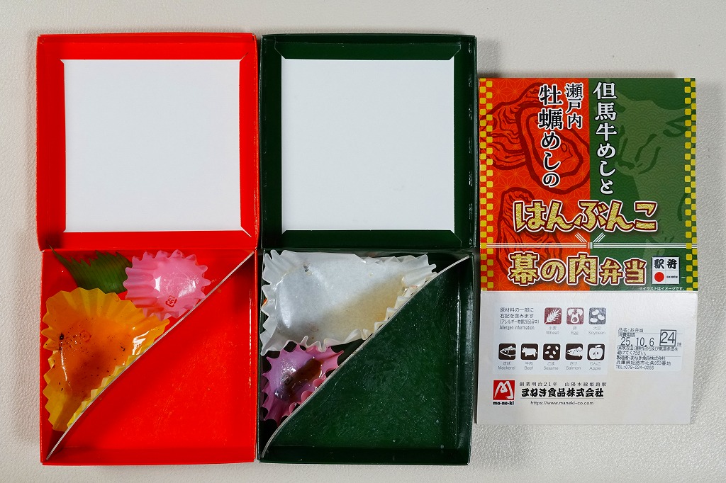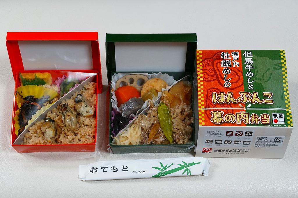 2025(令和7)年の9月までに姫路駅などで発売か。緑色と橙色の紙容器を縦に重ね、商品名を記した同色のスリーブにはめる。中身は緑色の部分が「但馬牛めし」で、だし飯を牛肉とごぼうの煮物で覆い、根菜などの煮物や黒花豆などを添えるもの。橙色の部分が「瀬戸内牡蠣めし」で、牡蠣だし飯に牡蠣の蒸し焼きを3個並べて、ひじき煮と玉子焼きとちくわ磯部揚げと小松菜漬を添えるもの。牛めしと牡蠣めしではんぶんこ、さらに御飯とおかずではんぶんこ。「幕の内弁当」の要素は、まったくないと思う。