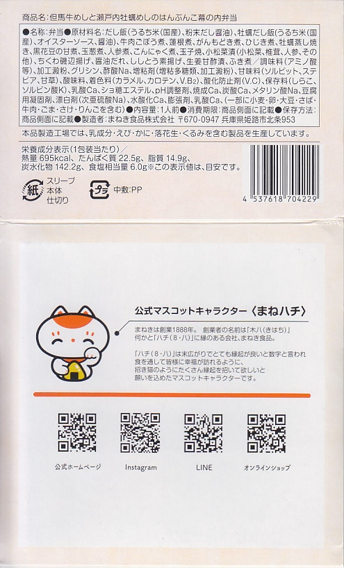 秋冬の駅弁大会シーズンに向けた、2019(令和元)年秋の新商品か。中身は駅弁の名前のとおりで、白飯に但馬牛を載せる下段と、焼サバ、コロッケ、煮物、黒豆、漬物などを収める上段の組合せ。但馬牛の使用をふたと食品表示で名乗るが、そんな高級な牛肉が使われているような雰囲気はなかった。姫路駅で買えるかどうかは分からない。価格は2020年の購入時で1,190円、2023年時点で1,200円。