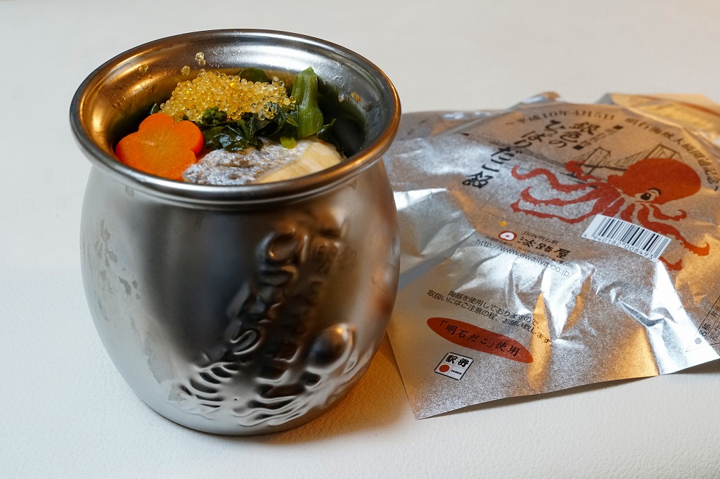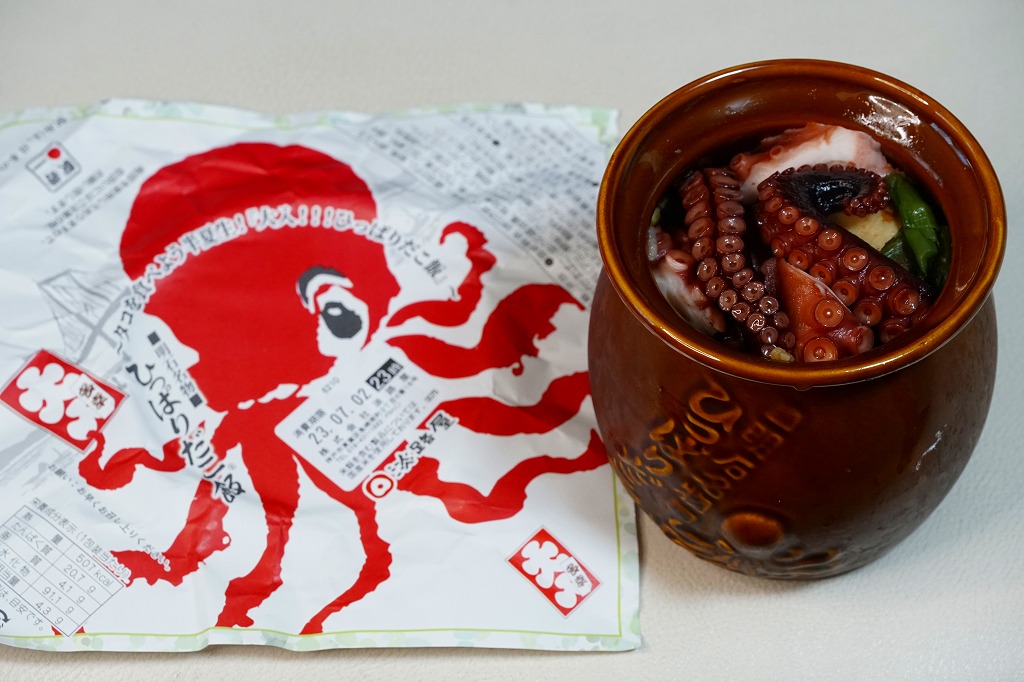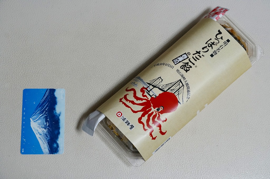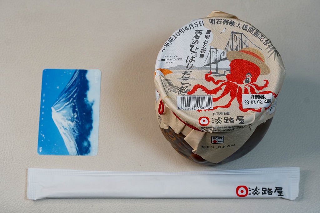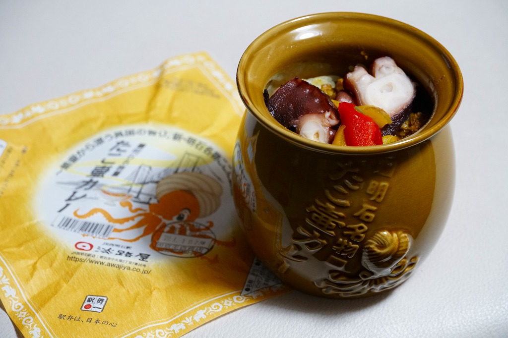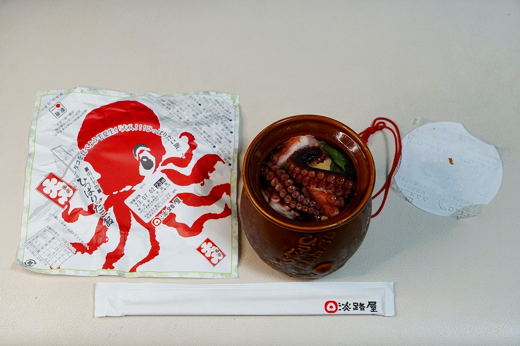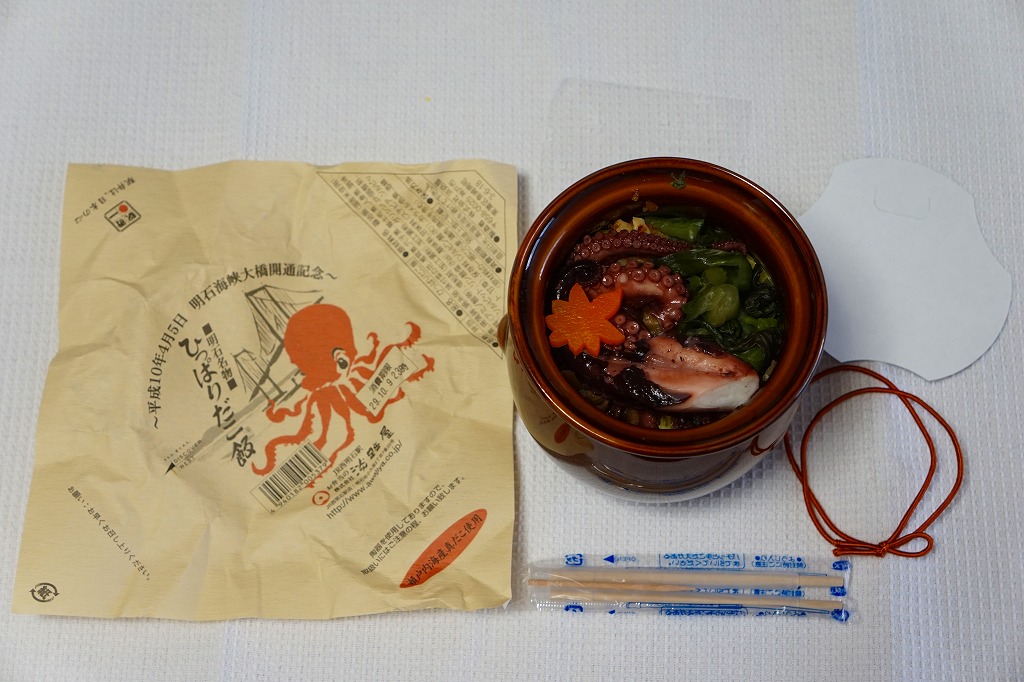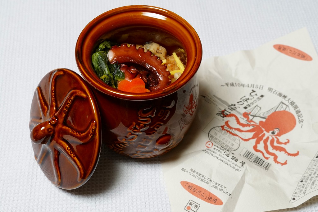 1998(平成10)年4月5日の明石海峡大橋開通を記念して発売。明石や神戸と関西や日本を代表する、有名で人気の駅弁。関西人ならみんなこのタコツボ容器を持っているといわれる。たこつぼ状の茶色い焼き物容器の中に、明石のタコのうま煮やすり身天ぷらを、醤油味の炊き込み御飯やタケノコ・穴子・松茸・人参などとともにぎっしり詰める。掛紙の裏面に追記されたとおり、明石だこの不漁により、2017(平成29)年5月から瀬戸内海産のタコを使っているという。