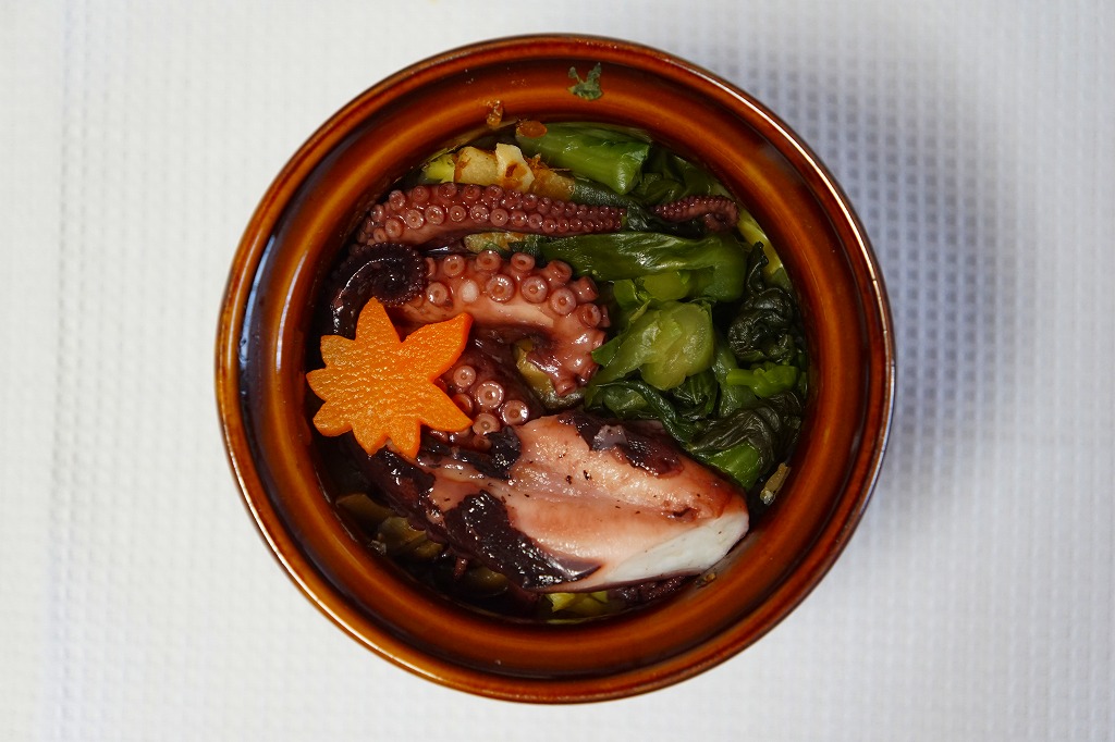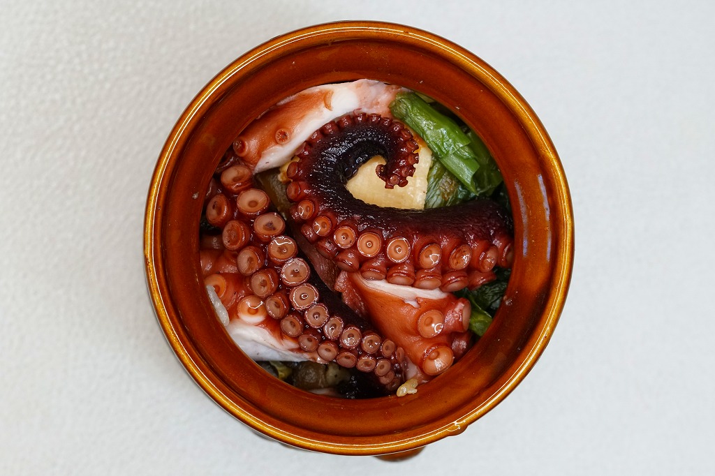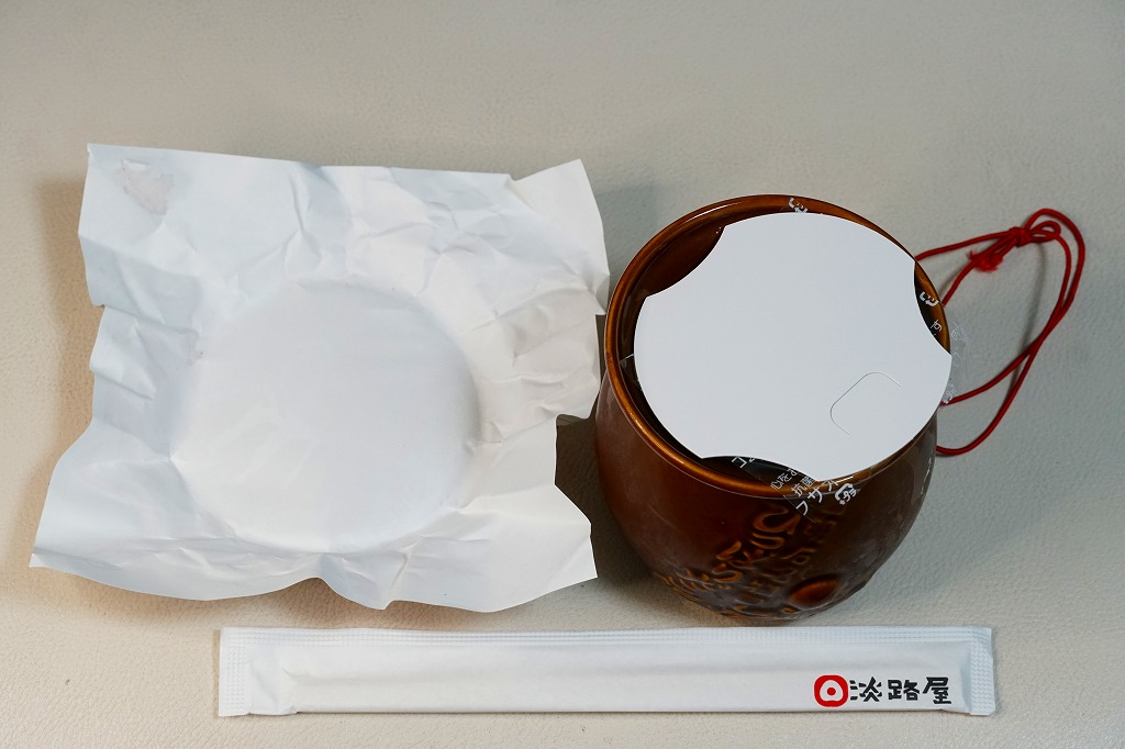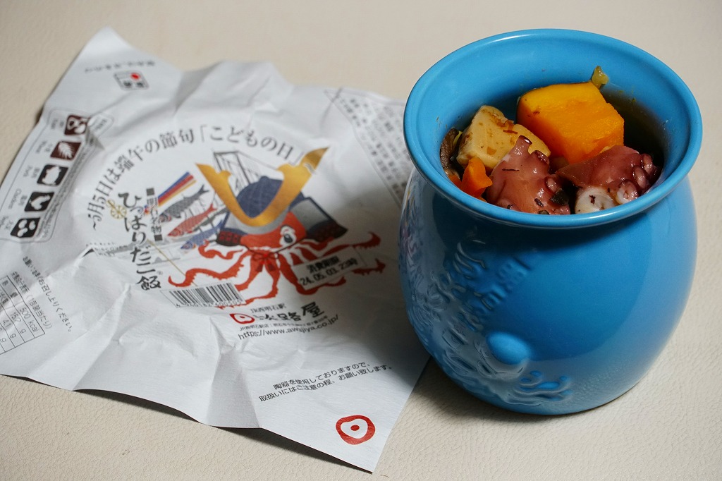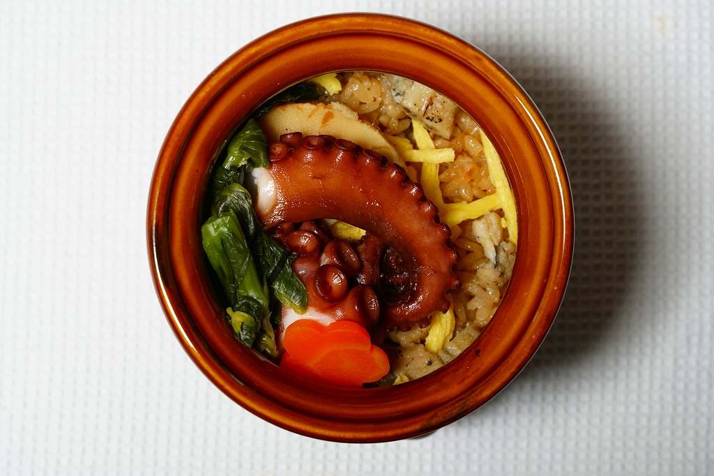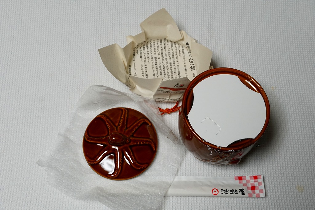タコツボ型の陶器や掛紙のつくりは通常版と同じでも、掛紙に描いたタコも普段の3倍大きく見える。中身は味付き飯にタコ煮、錦糸卵、菜の花、椎茸煮、穴子煮、タケノコを詰め、揚げかまぼこを仕込むもので、内容は通常版と同じ。タコ煮が増えたぶん、ふたを開けたらほぼタコ。刻まれたり混ぜたりしないため、大きくて飯をほじくりにくくて食べにくいとも思うし、豪快だとも思う。
