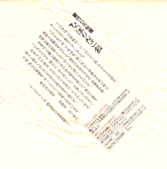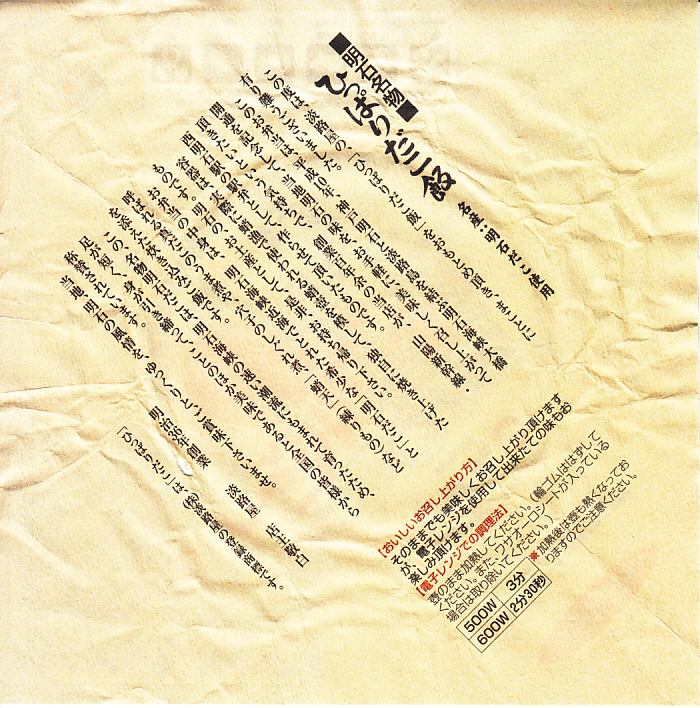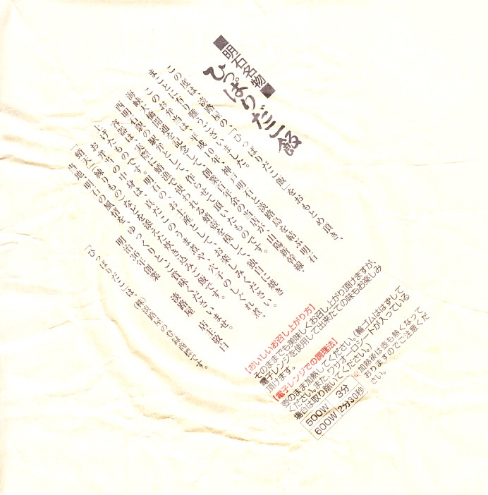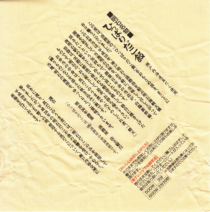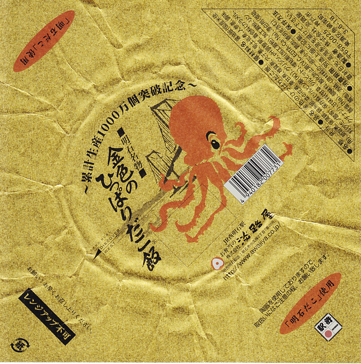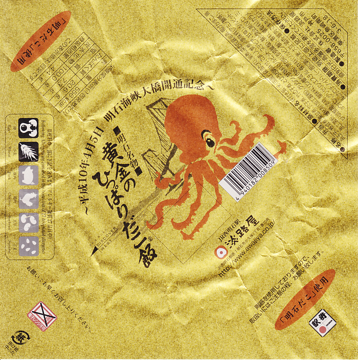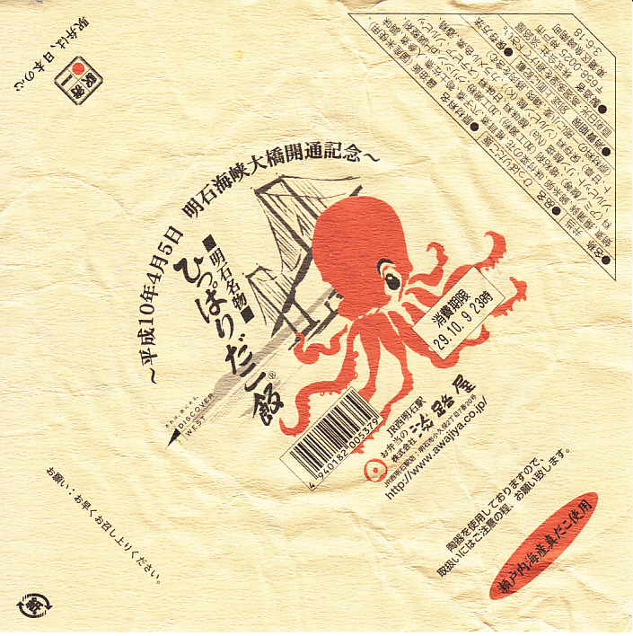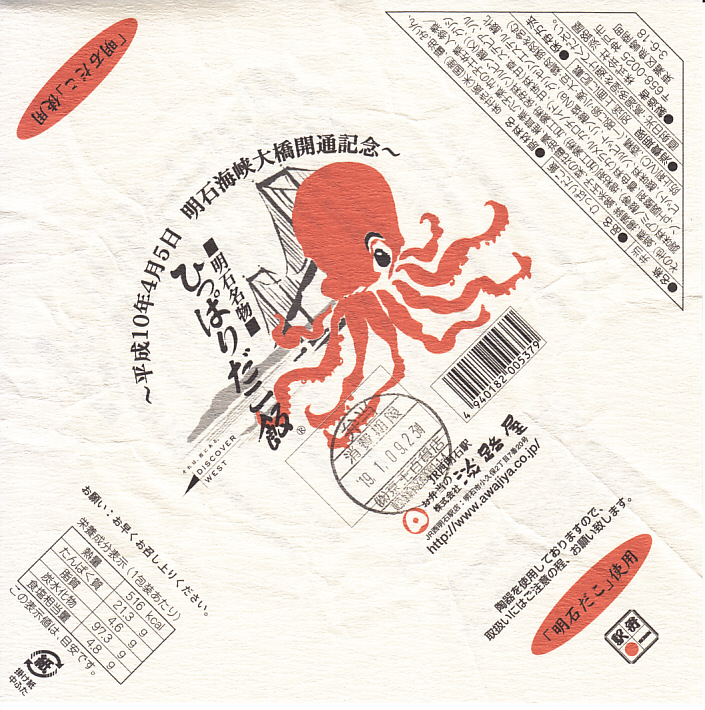 2001(平成13)年12月1日に購入した、西明石駅弁の掛紙。当時は「明石名物」でなく「明石名産」ひっぱりだこ飯であった。公式サイトのURLや、「紙」のリサイクル識別表示も、まだついていない。