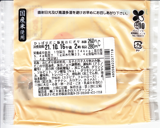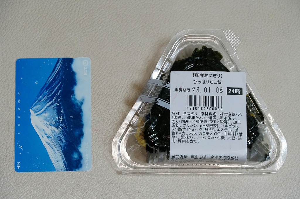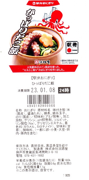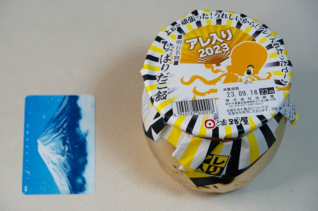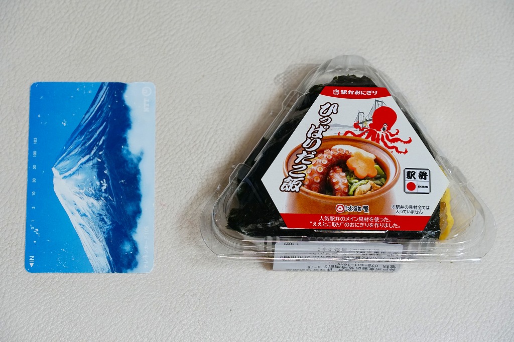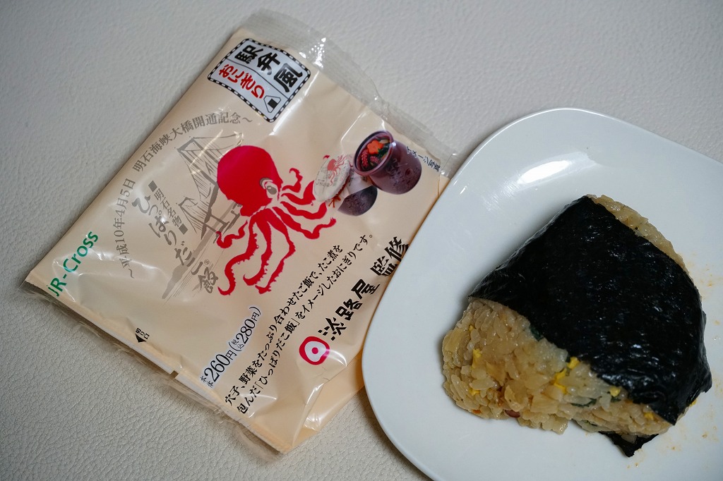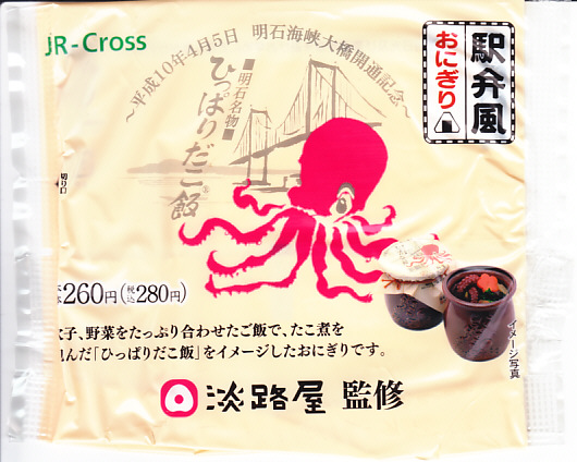 2023(令和5)年1月の京王百貨店の駅弁大会で販売。現物からは読み取れないが、「SDGs×駅弁」として「人気駅弁の端材おにぎりでフードロス削減」と広告し、3種類または5種類のおにぎりを輸送販売した。これは西明石駅弁「ひっぱりだこ飯」のもので、タコ煮と錦糸卵を味付き飯に押し付けて海苔で巻いた三角おにぎりを1個、商品紹介と食品表示のラベルを貼ったプラ製ケースに収めたもの。駅弁と同じ調製元が作るため、駅弁と同じ味がして、その点で下記のようなコンビニの再現品よりも本格的であり、価格もこなれている。いつかどこかで売られるように、なるかどうか。