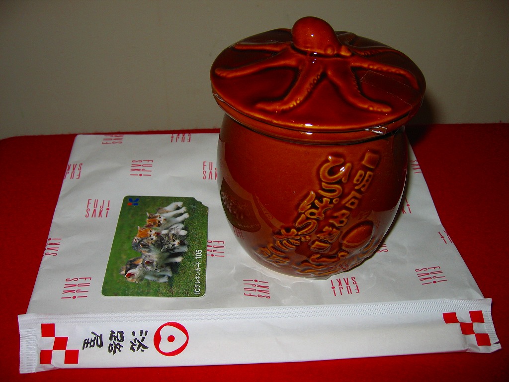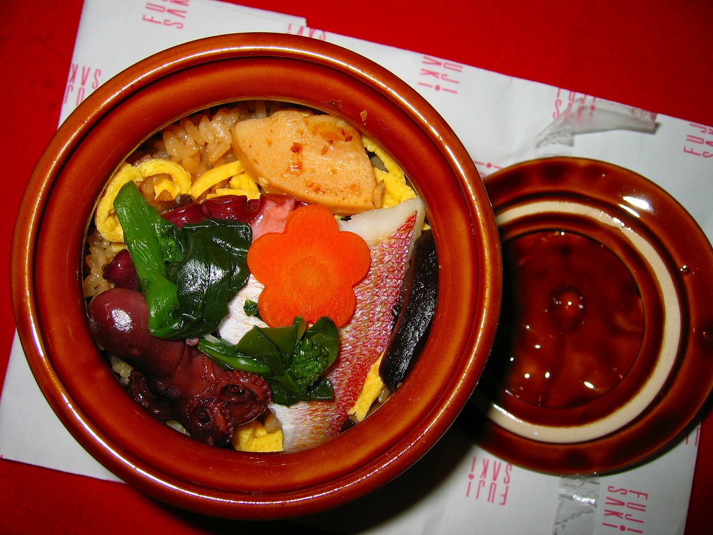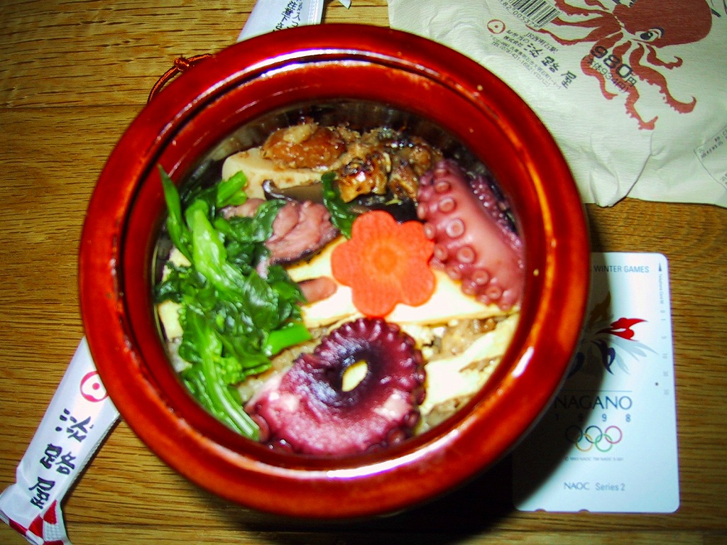 2008(平成20)年2月3日から8日まで、仙台の藤崎本店で開催された駅弁催事「全国駅弁大会とうまいもの市」で、実演販売されたお弁当。通常版のひっぱりだこ飯とともに、今回の催事でのオリジナル商品として、フタも陶製にしたバージョンが売られていた。中身は通常版とまったく同じ。フタは後からこしらえたとは思えないほど、本体の壷に自然な感じで組み合わさる。これが駅弁として販売されていれば疑義駅弁だが、ここではチラシでも実演ブースでもオリジナルと明記していた。現地にあっても、おかしくないような。