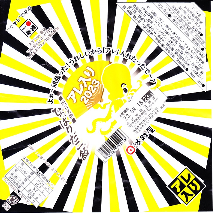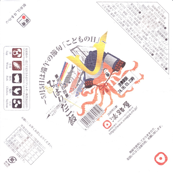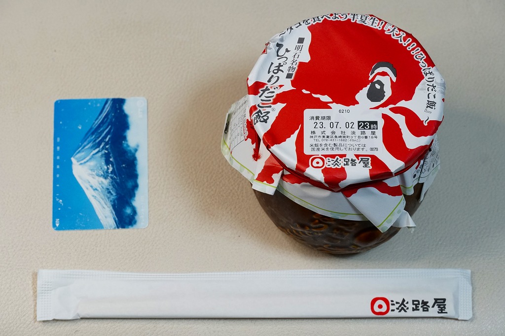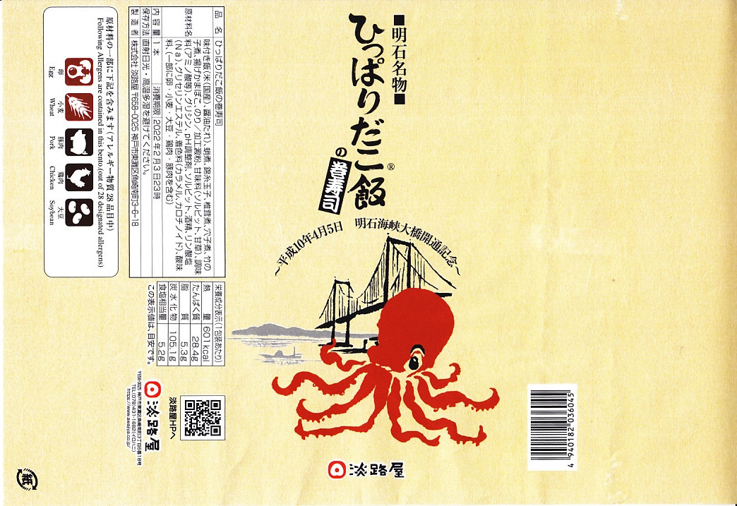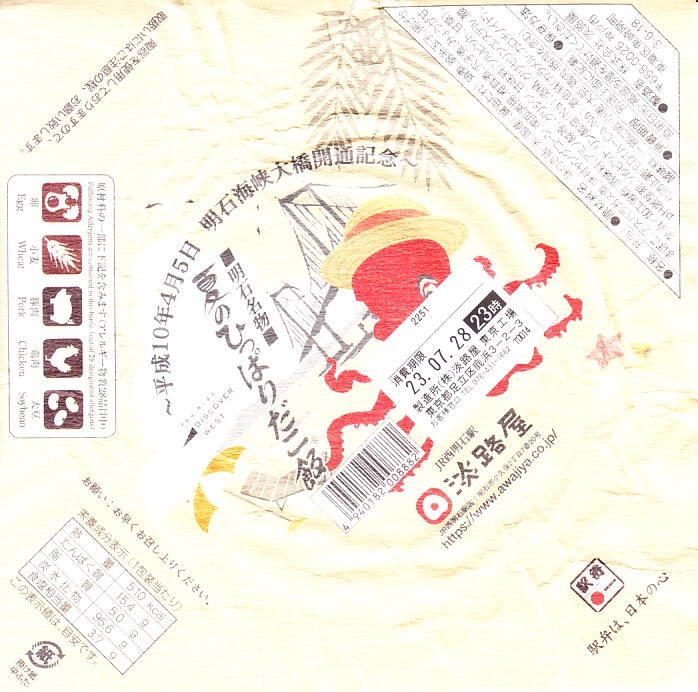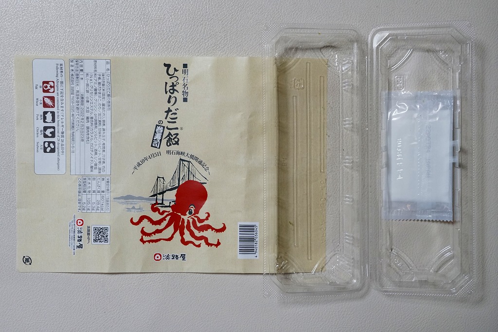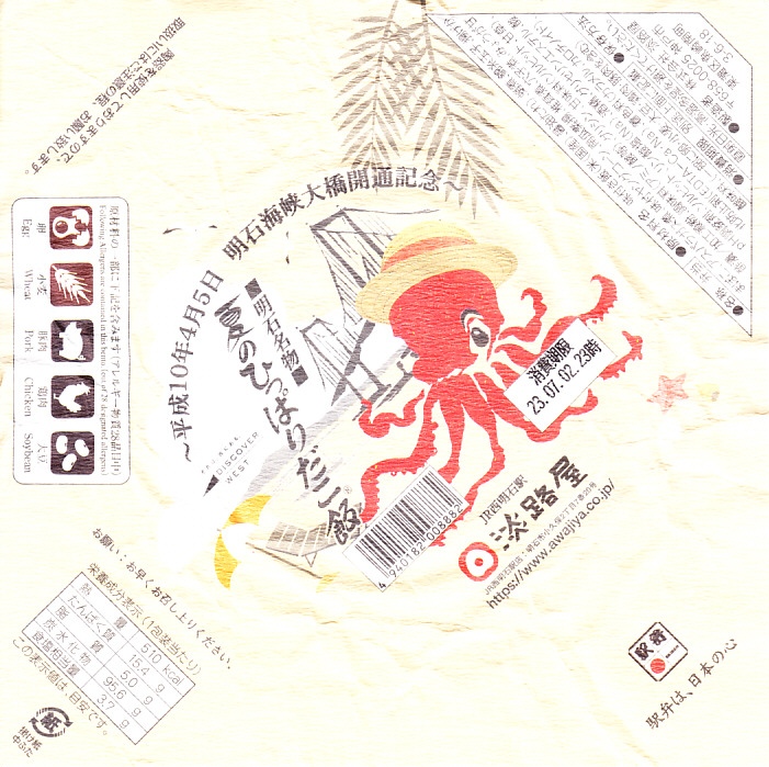 2023(令和5)年7月28日に購入した、西明石駅弁の掛紙。上記の「夏のひっぱりだこ飯」と同じ月に買ったので、掛紙もタコツボ容器も中身も味も同じもの。兵庫県神戸の調製元は2022年8月に東京都足立区へ東京工場を設け、東京駅などで売る駅弁を東京で作るようになった。消費期限の表記を現地版の印字でなくシールとし、そこに東京工場の名前と所在地を記した。