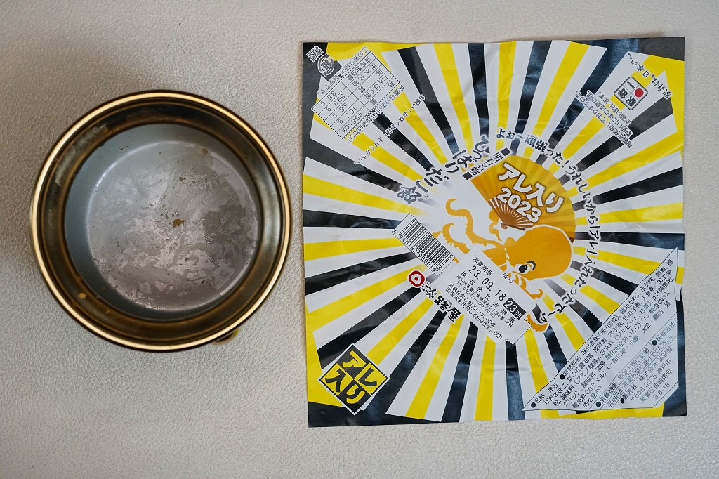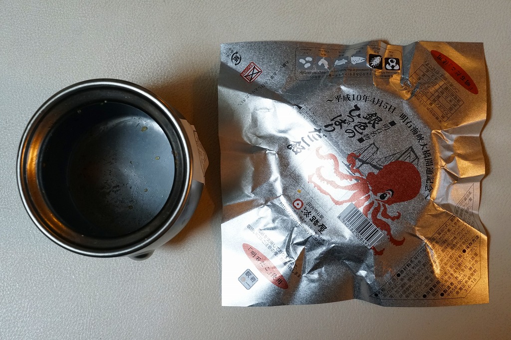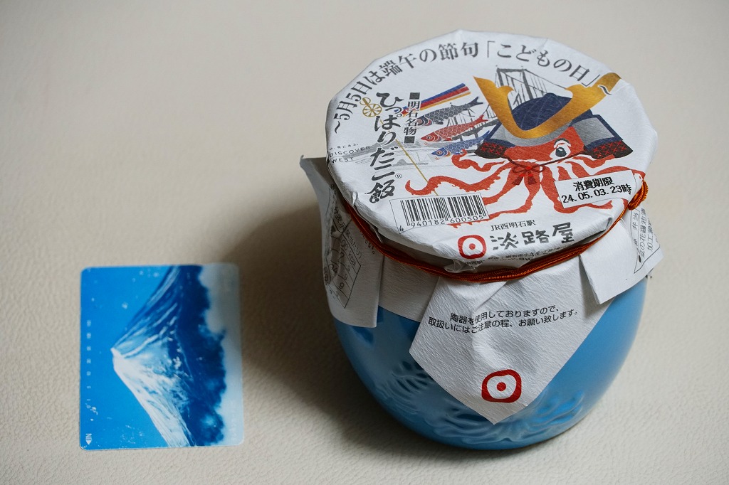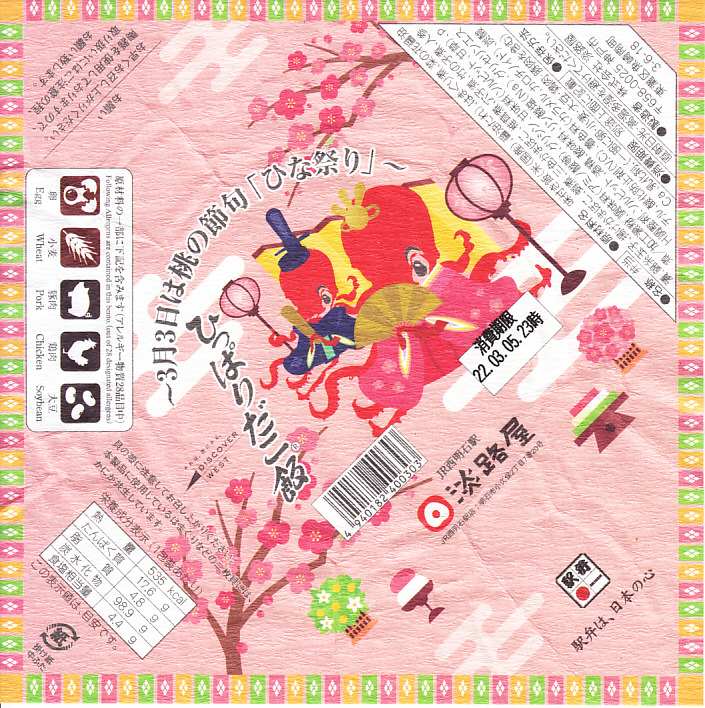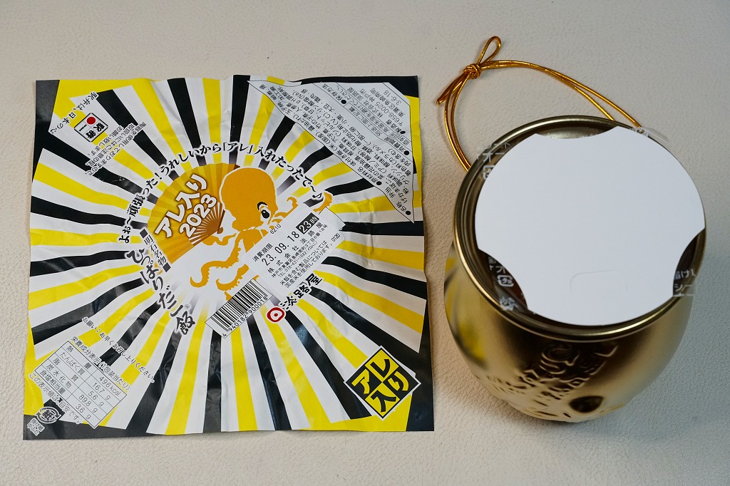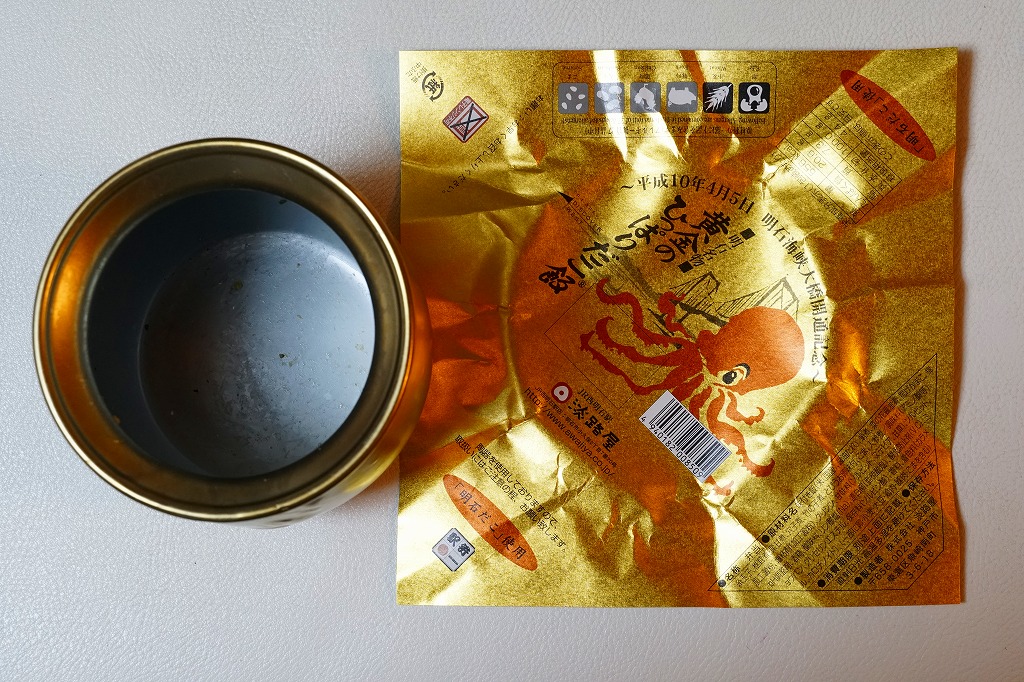 2023(令和5)年7月28日に購入した、西明石駅弁の掛紙。上記の「夏のひっぱりだこ飯」と同じ月に買ったので、掛紙もタコツボ容器も中身も味も同じもの。兵庫県神戸の調製元は2022年8月に東京都足立区へ東京工場を設け、東京駅などで売る駅弁を東京で作るようになった。消費期限の表記を現地版の印字でなくシールとし、そこに東京工場の名前と所在地を記した。