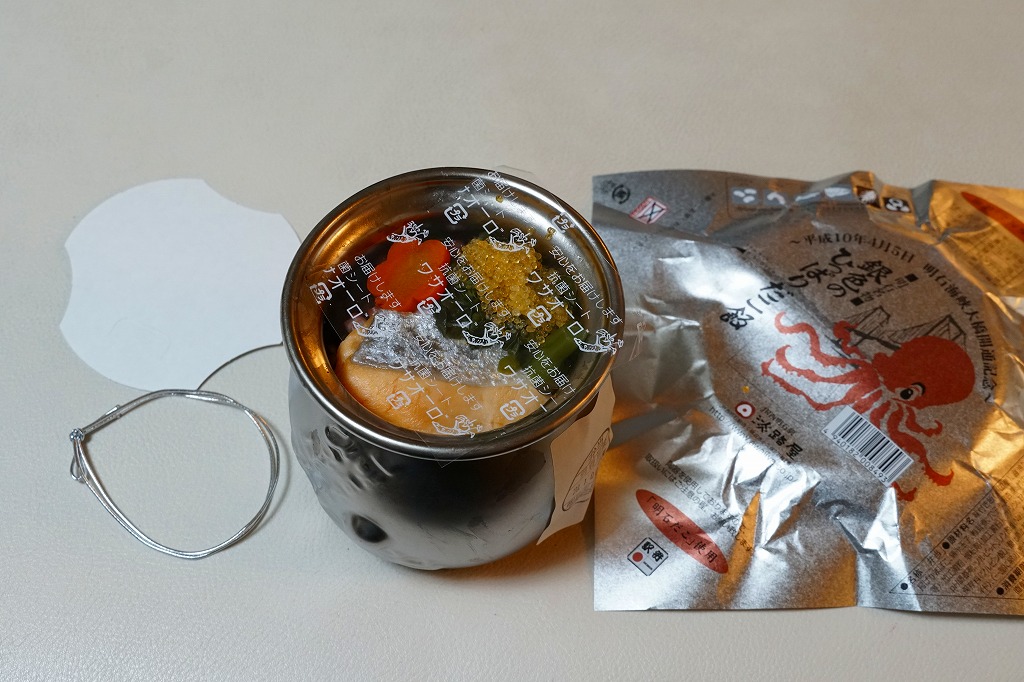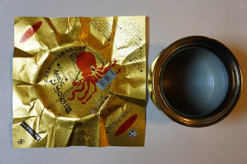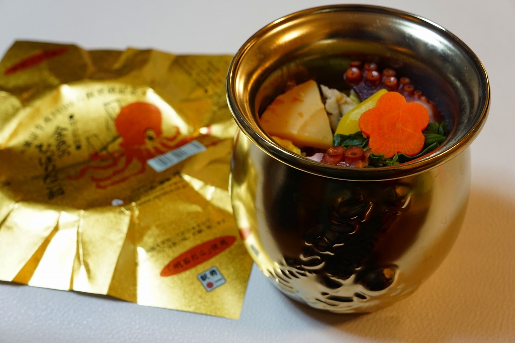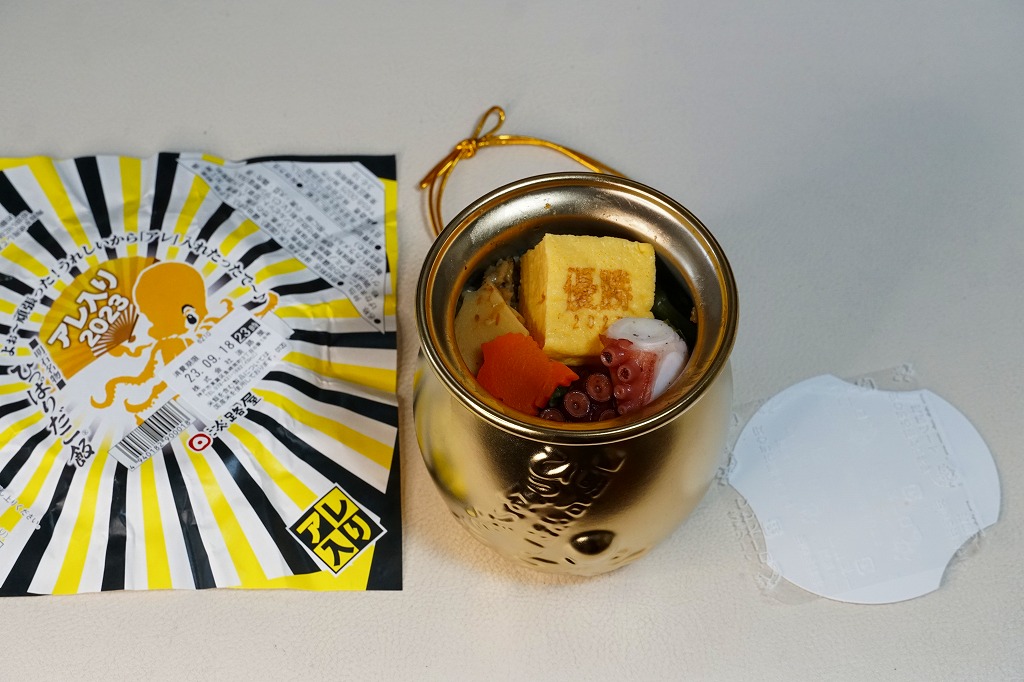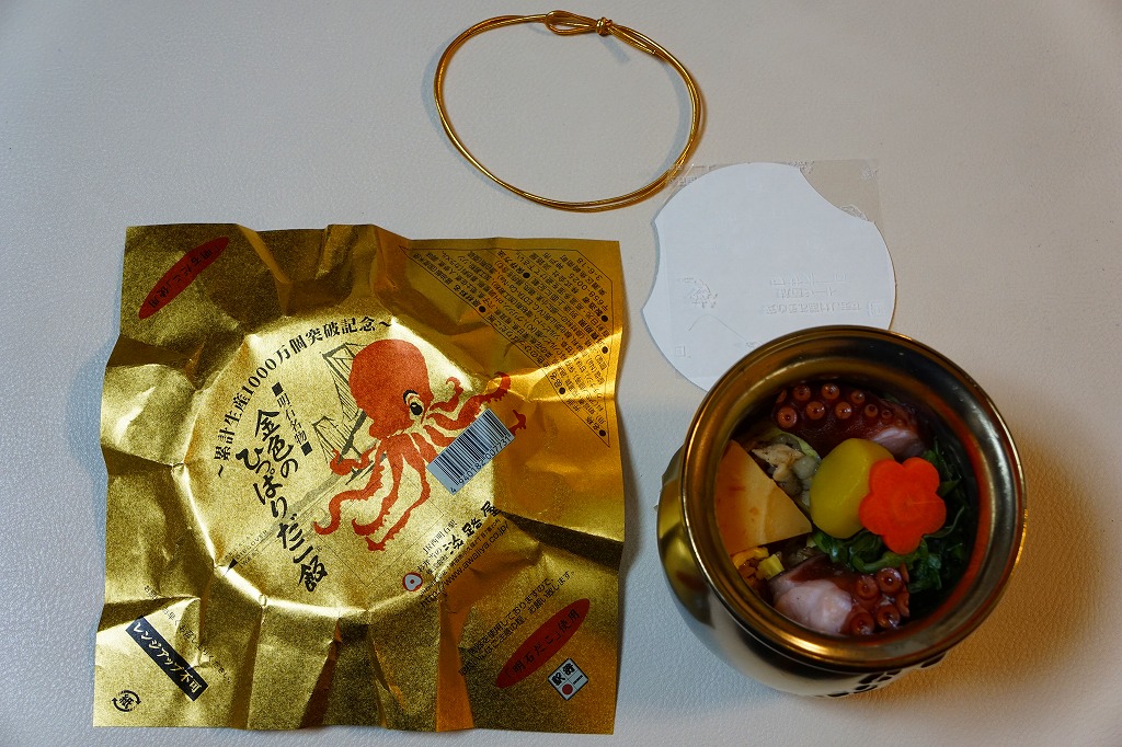 この催事では「黄金」とこれと通常版で、3種のひっぱりだこ飯を実演販売。この年の夏には東京五輪が開催予定で、後に政府の新型コロナウイルス感染症対策により開催が延期されてしまったが、催事場では五輪にちなんだと思われるような駅弁が出てきていた。ここでは黄金と銀色と、銅色にも見える通常版を、表彰台のような段違い台に並べた写真を調製元がSNSに投稿しており、なるほどなと思った。半世紀前の東京五輪当時と違い、今は権利が強大なので、五輪に関する記述は催事のチラシにも催事場にも、どこにもなかった。