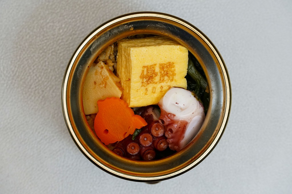 黄色と黒の模様でできた掛紙をかけた、「金色」や「黄金」のひっぱりだこ飯と同じ金色のたこつぼ型陶器に、醤油味の炊込飯を詰め、タコ煮、菜の花、刻み穴子、タケノコ、ニンジンを載せ、揚げかまぼこを仕込み、「優勝2023」と書いた玉子焼を詰める。なので、味は普段の「ひっぱりだこ飯」と同じ。