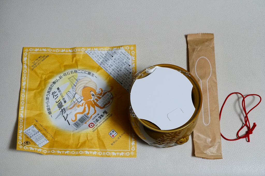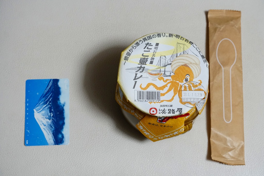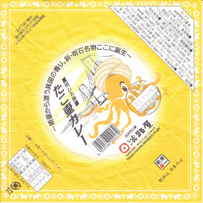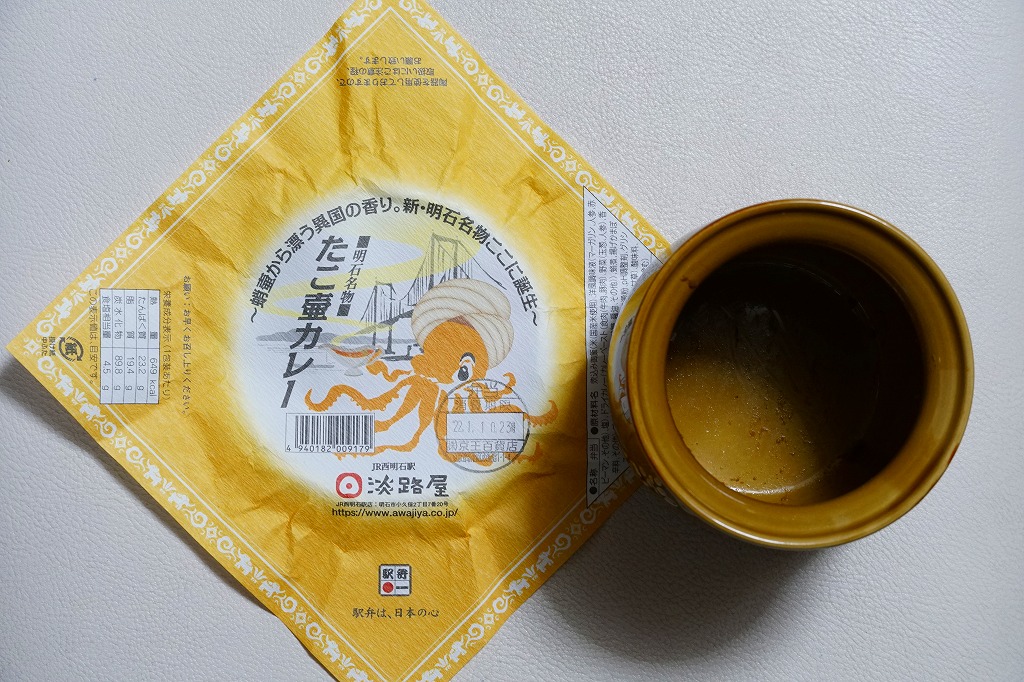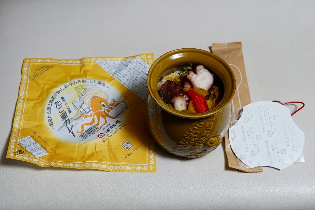 2022(令和4)年1月7日に発売。名物の駅弁「ひっぱりだこ飯」のカレー味。この駅弁は上記や下記の亜種と異なり「ひっぱりだこ飯」を名乗らなかった。正方形の掛紙といつものタコ壷がカレー色、ターメリック色になり、「〜蛸壷から漂う異国の香り。新・明石名物ここに誕生〜」とキャッチフレーズも新しい。