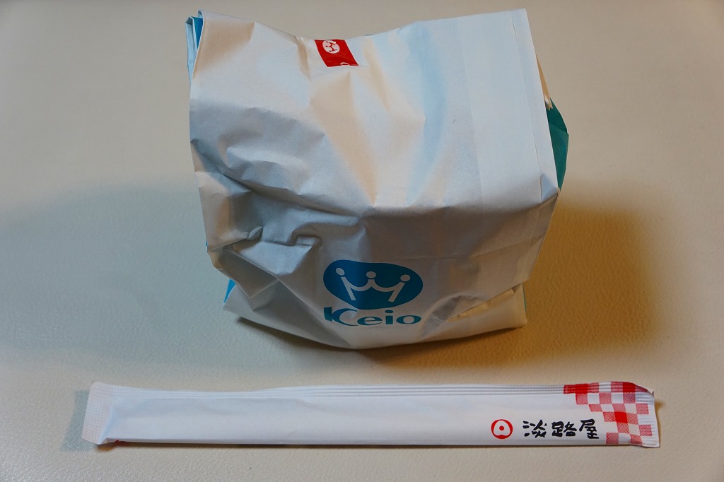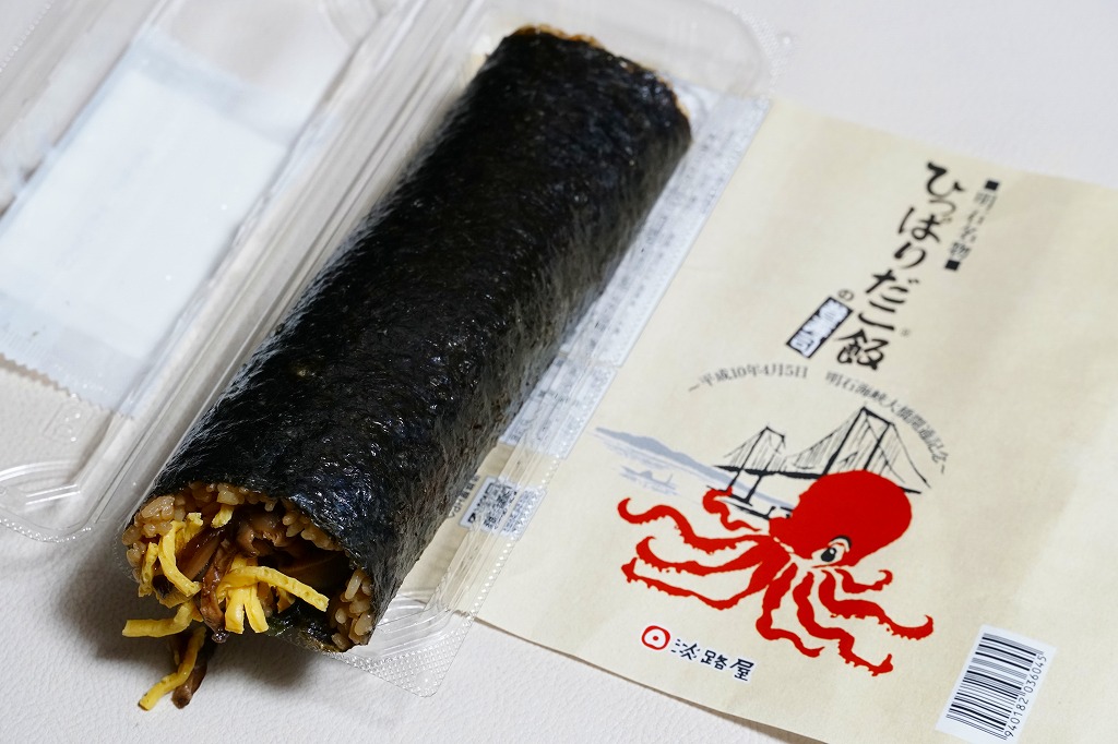 透明なプラ容器に、切らずに食べられる太さの海苔巻きが1本。その中身はひっぱりだこ飯と同じで、味付け飯にタコ煮、シイタケ煮、アナゴ煮、タケノコ煮、錦糸卵、そして揚げかまぼこまでも仕込み、掛紙も駅弁と同じ図柄。値段も含めて駅弁がかなり再現された。