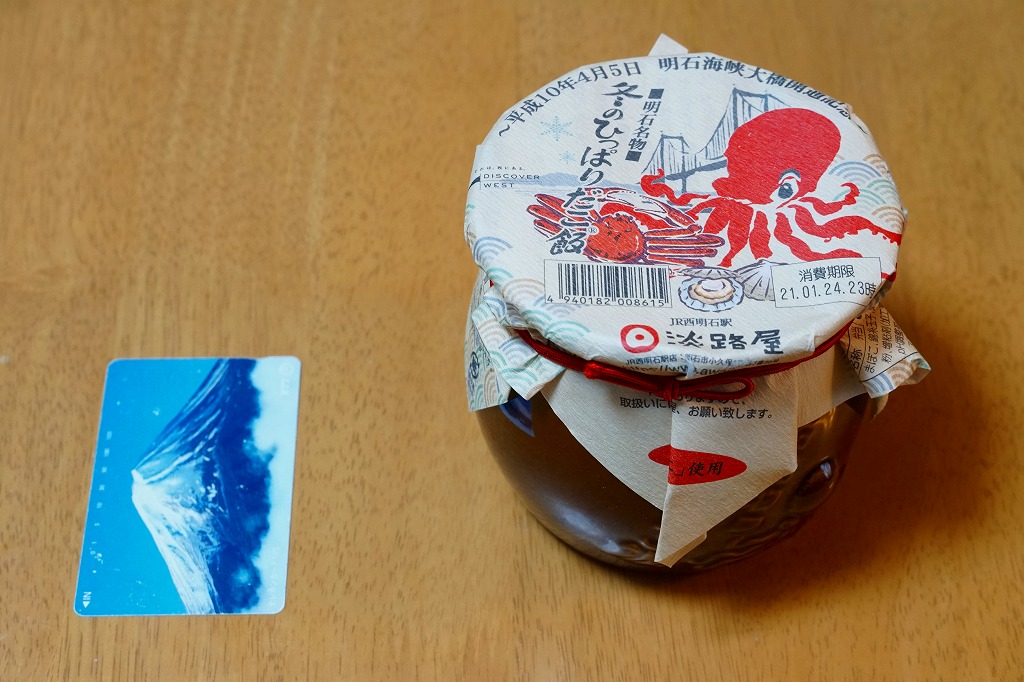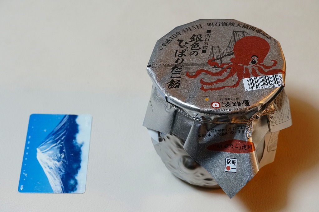 2019(平成31)年1月の京王百貨店の駅弁大会で販売。西明石駅弁「ひっぱりだこ飯」について、本体と同じ素材のふたを付けたもの。下記のとおり11年前の販売を覚えていたので、今回はどのように売るのか楽しみにしていたら、通常版にふたを別添する形で販売した。つまり、ふたを270円で買ったようなもの。同月の阪神百貨店の駅弁大会でも販売した。