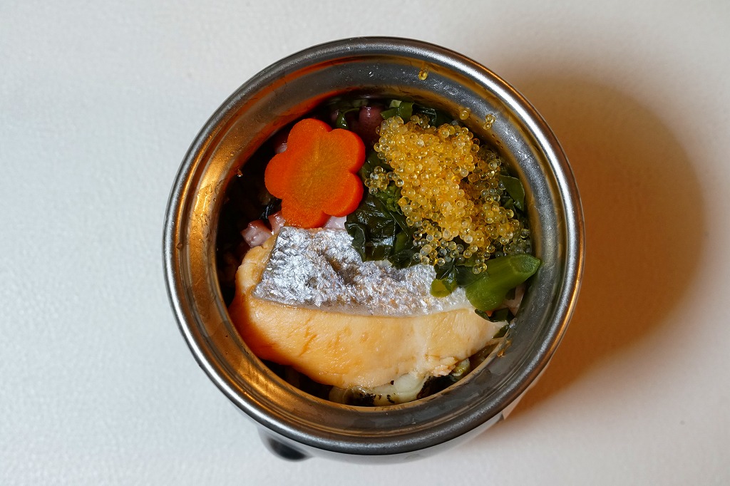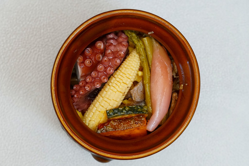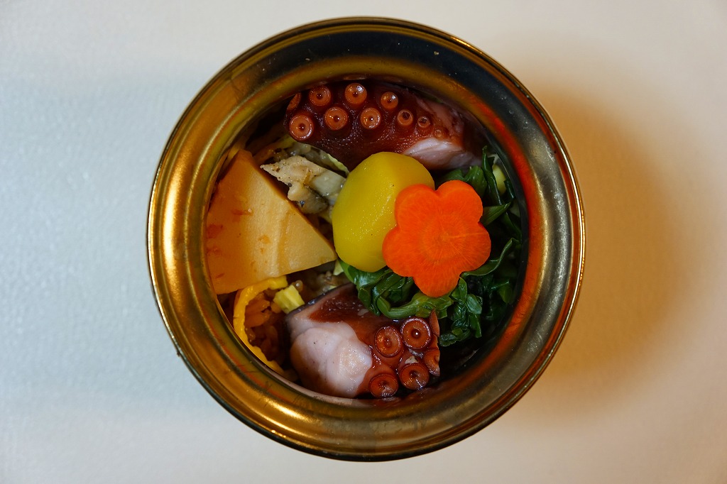 金色に染めた陶製タコ壷容器に、タコやシイタケを混ぜた醤油飯を詰め、タコ煮、菜の花、刻み煮穴子で覆い、揚げかまぼこを仕込むまでは、通常版と同じ。これにクリとトビコと金胡麻を加えて黄金を演出し、価格を300円、「金色」よりも30円上げた。だから味やその印象もまた、おおむね通常版と同じだった。