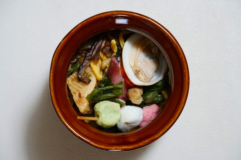 中身は茶飯をはまぐり煮、三色かまぼこ串、タコ煮、アナゴ煮とシイタケ煮の刻み、タケノコ煮、にんじん煮、菜の花醤油漬、錦糸卵で覆い、丸い揚げかまぼこを底に仕込むもの。通常版からタコを減らし、ハマグリとかまぼこ串を入れた感じで、その分だけ味が少し柔らかい。2022年は2月26日から3月5日まで1,200円で販売、2023年は3月1日から3日までの販売。2024年は1,350円、2025年は1,380円。