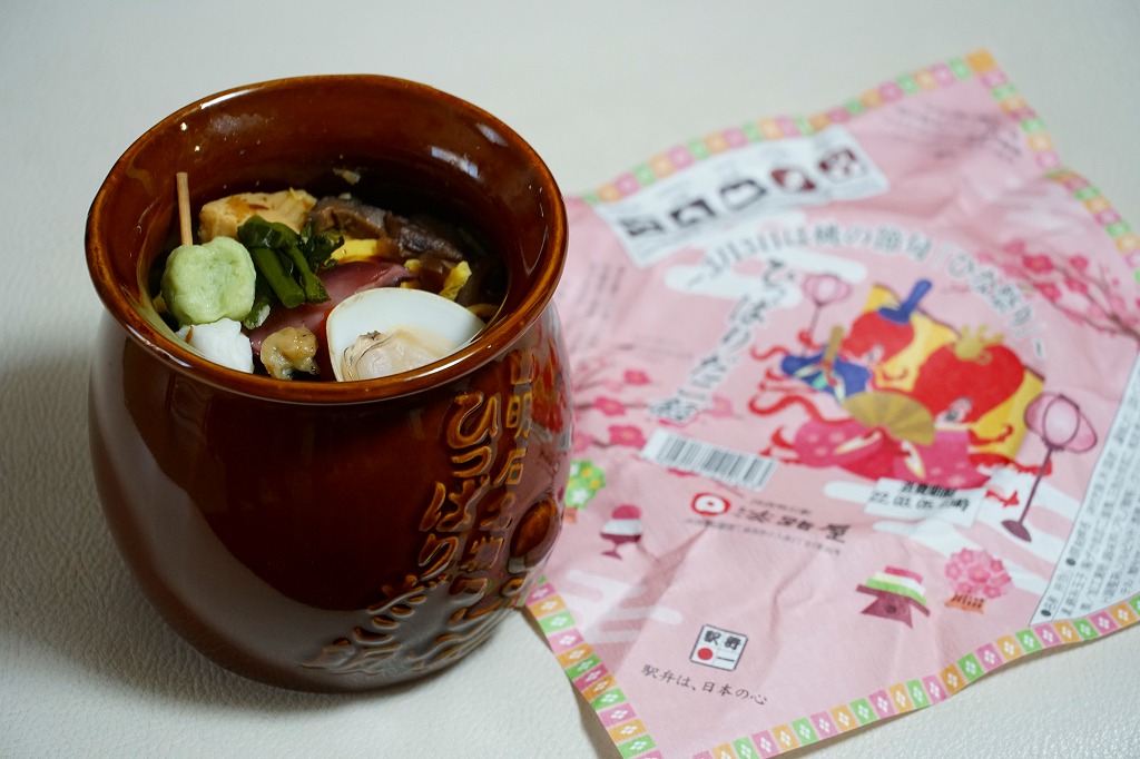 2021(令和3)年2月27日から3月3日まで、1,100円で販売。名物の駅弁「ひっぱりだこ飯」で、初めて出てきたひなまつりバージョン。タコツボ型の陶器は通常版と共用、掛紙のタコは男雛と女雛になり、背景は梅の花と色になり、表題は「〜3月3日は桃の節句「ひな祭り」〜」となった。