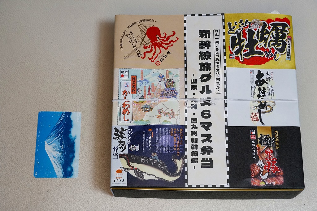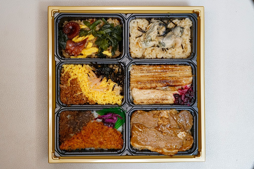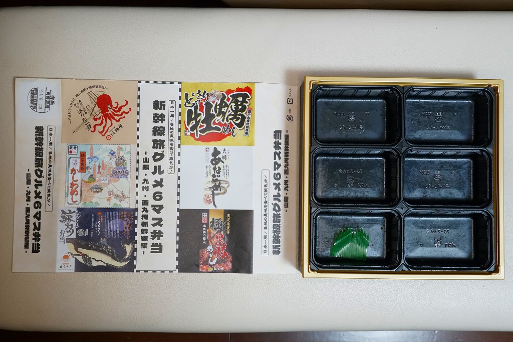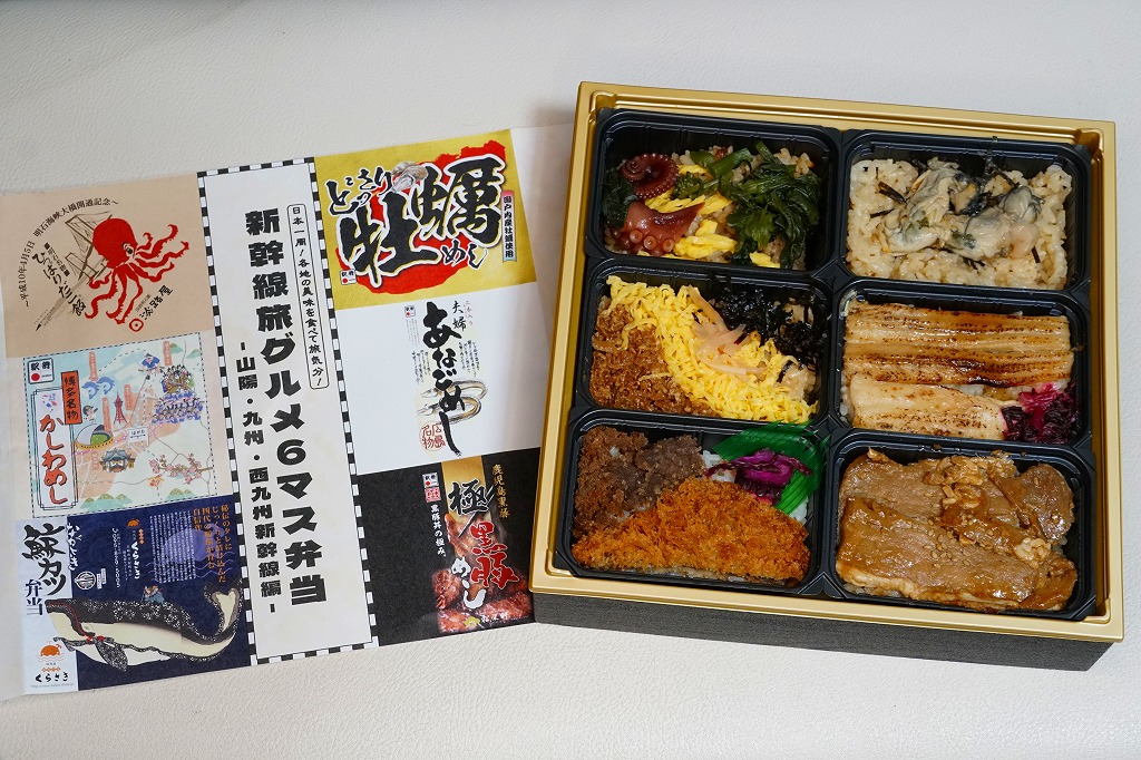 2025(令和7)年1月の京王百貨店の駅弁大会で販売。同大会の60回を記念し、新幹線の停車駅で販売している各地域の駅弁を6マスに詰めた弁当を実演販売した。これは東海道新幹線、上越・北陸新幹線、北海道・東北・山形新幹線、山陽・九州・西九州新幹線の4種類のうち「山陽・九州・西九州新幹線編」で、西明石駅「ひっぱりだこ飯」、姫路駅「どっさり牡蠣めし」、博多駅「かしわめし」、広島駅「夫婦あなごめし」、長崎駅「ながさき鯨カツ弁当」、出水駅「極黒豚めし」の詰合せ。掛紙はその6種類の駅弁の絵柄の組合せで、大きな正方形の容器に6個のプラ製トレーを同じ大きさで詰め、それぞれの中身をミニサイズに収めた。ここでの筆頭は西明石駅「ひっぱりだこ飯」で、その中身から飯とタコと菜の花と錦糸卵を取り出した。