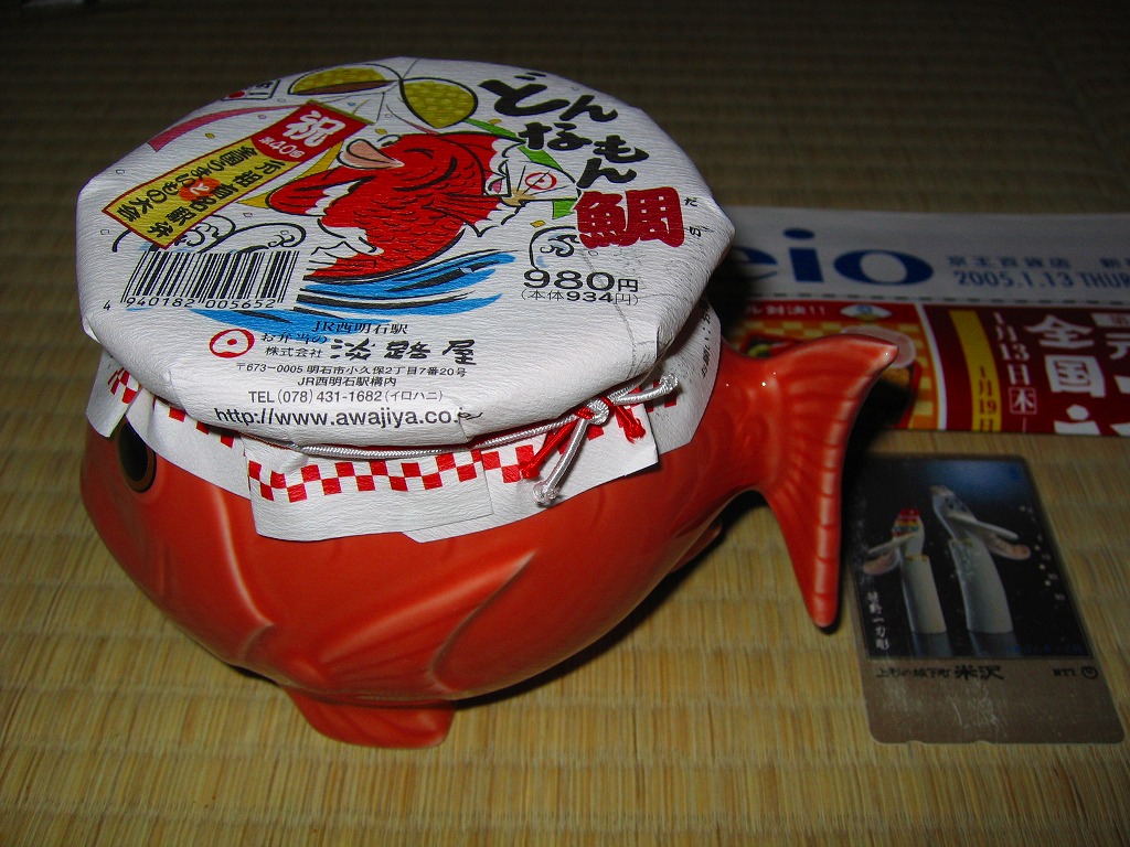 1999(平成11)年に発売。尻尾の付いたユーモラスな形の陶器を容器に使用、鯛の骨で出汁を取り鯛の子を混ぜた炊き込み御飯の上に、小鯛の酒蒸しを、錦糸卵や菜の花和えとともに載せる。現在は販売されていない模様。