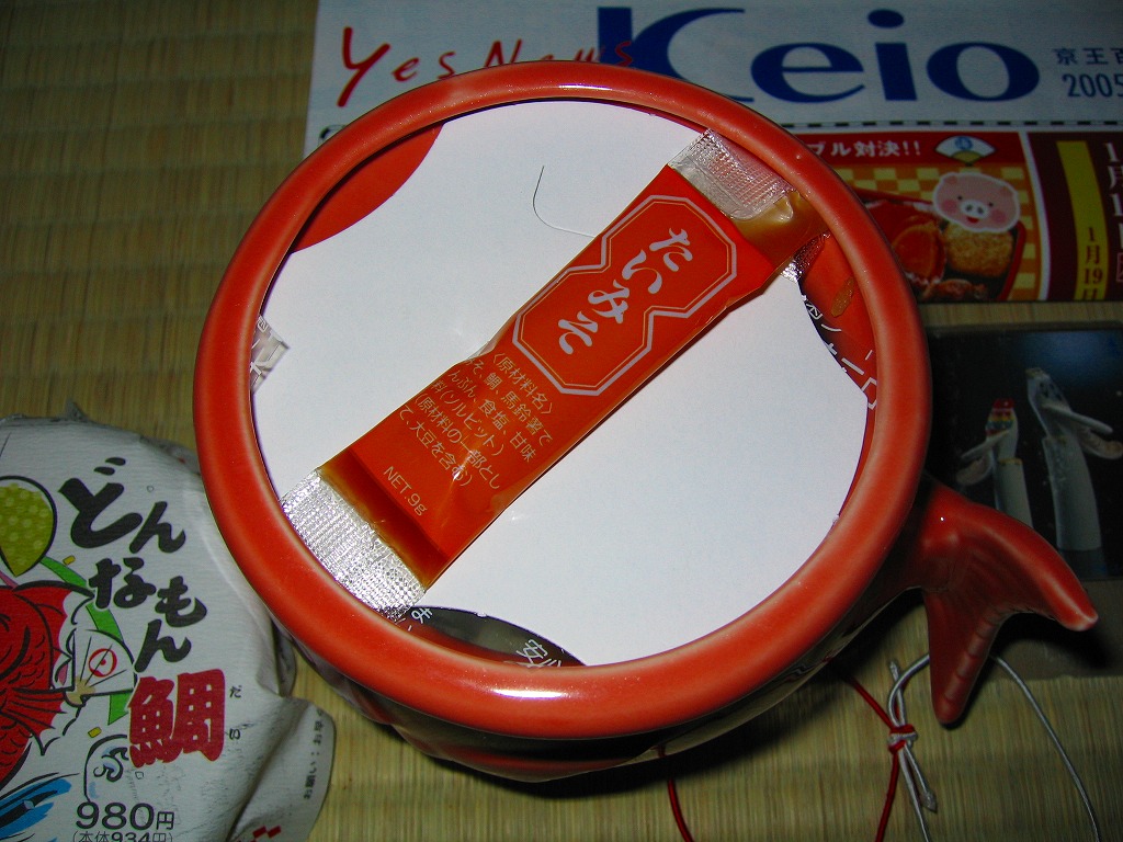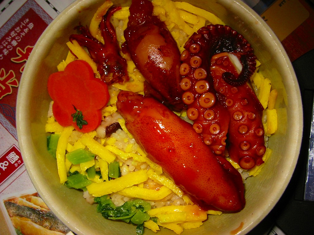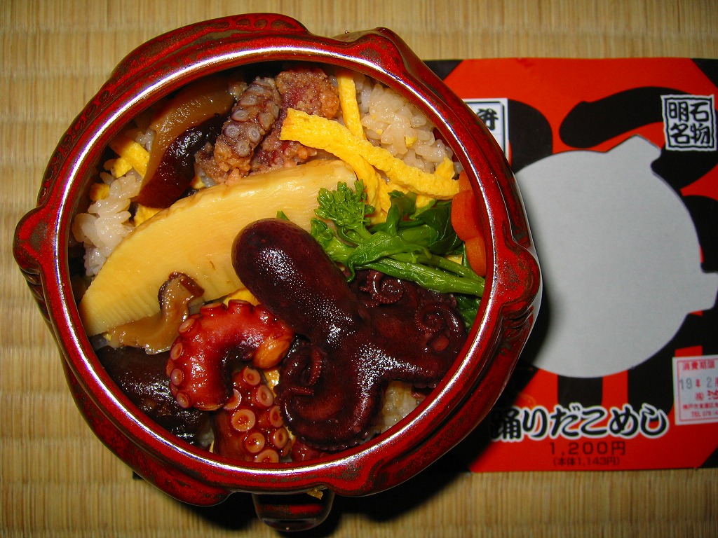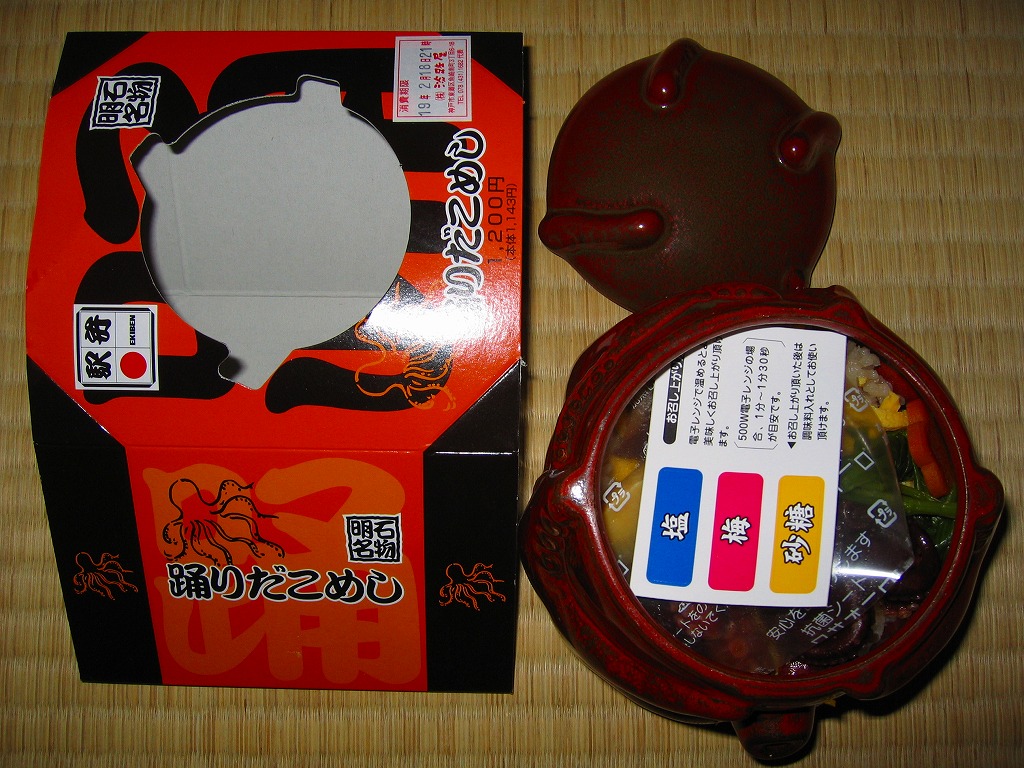 2007(平成19)年1月12日に発売か。商品名とマーク数点を書いたボール紙の枠から、新品にして年季が入ったような色合いの容器が見え隠れる。タコが頭(正確には胴体)を抱えた形状の陶器の中にはタコの炊込飯が詰まり、その上にタコ唐揚、タコ辛味噌、イイダコ旨煮と、タケノコや椎茸などの煮物と錦糸卵に菜の花が載る。容器は調味料入れへの流用を推奨し、塩・梅・砂糖のシールが付く。