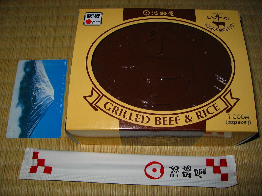 2005(平成17)年の秋に発売。牛の文字とシルエットを浮き彫りにした、楕円形の小さくビーフ色なプラ容器を、窓開きな紙箱に収める。中身は白御飯の上に牛焼肉、タマネギやパプリカの炒め物、ししとう、甘いニンジンを載せるもの。