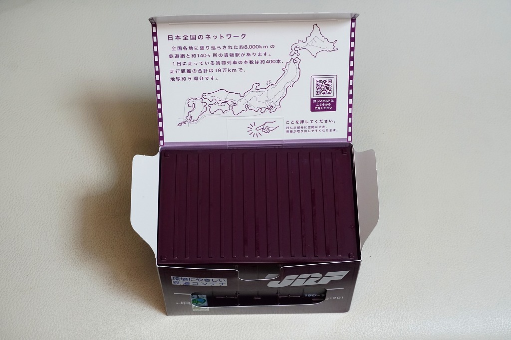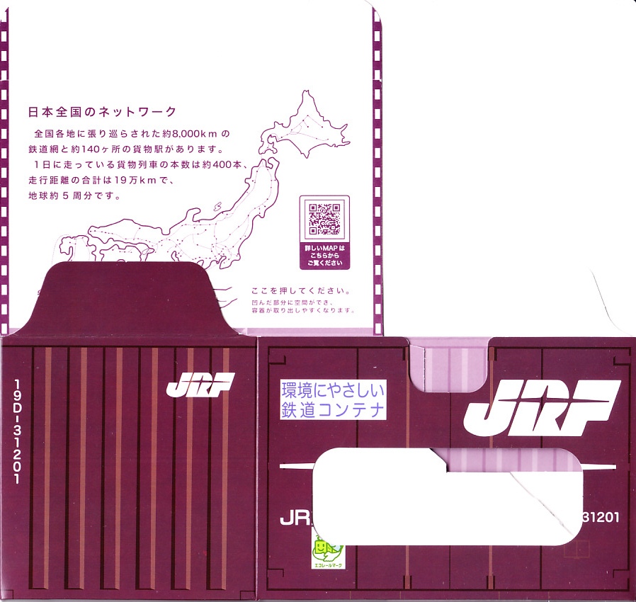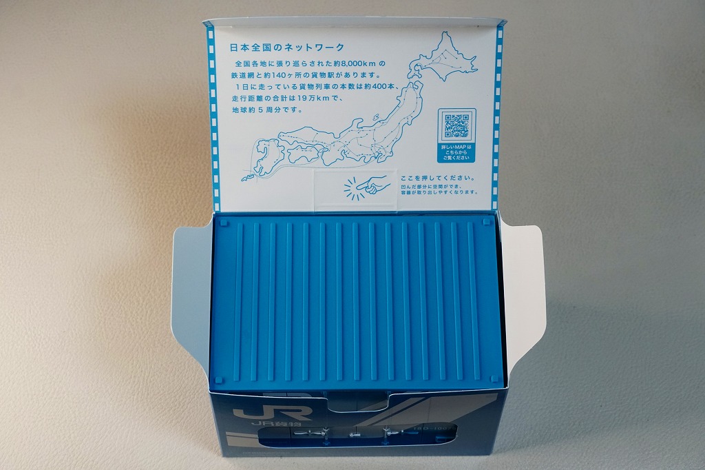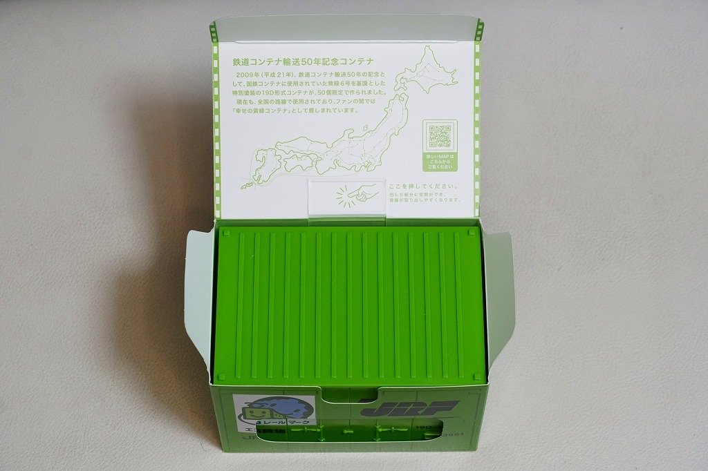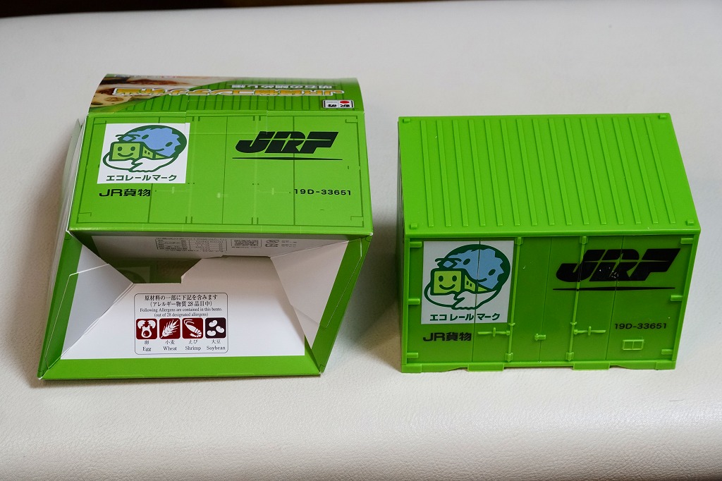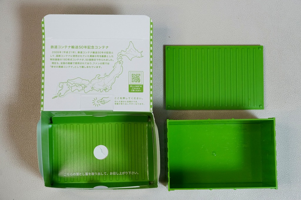 この駅弁で模した鉄道コンテナは、2009年に50個を製作。日本国有鉄道の本格的な鉄道コンテナ輸送のさきがけとなった、貨物列車「たから号」が運転を開始した1959(昭和34)年11月5日から50年目となることを記念する行事の一環として、JR貨物がこの年に購入した19D形式鉄道コンテナのうち50個を、国鉄時代の緑色に塗った。絵柄は当時のJR貨物の標準的なもので、国鉄時代のものとは異なる。1%以下の確率で、このコンテナを載せた貨物列車が見つかるかも。
