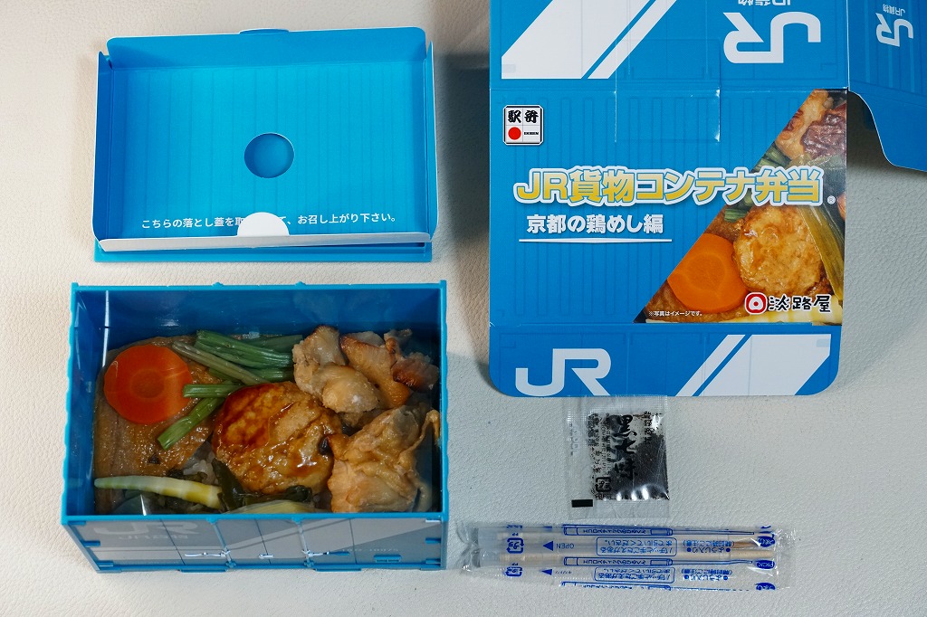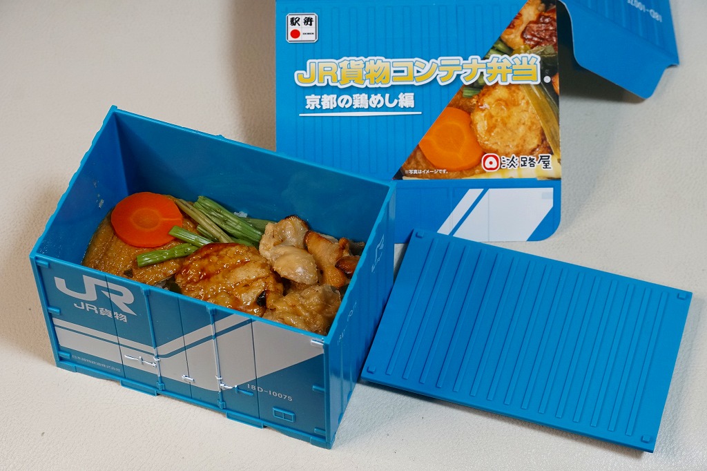 JR貨物承認済の商品で、ふたを開けると全国地図を用いたJR貨物の鉄道路線図と、貨物列車の紹介文が現れる。中身は「京都の鶏めし編」ということで、油揚げの炊き込み御飯を、鶏照焼、鶏つくね、油揚げ、わらび、ねぎ、姫竹、すぐき、にんじんで覆い、原了郭「黒七味」を添付。京王百貨店の駅弁大会では「きつねの鶏めし」をモチーフにしたと紹介し、食べた印象はほぼ同じ。価格は2024年の発売時で1,680円、2025年時点で1,780円。