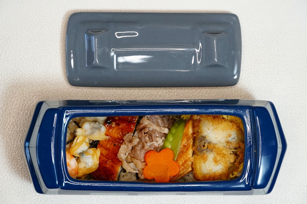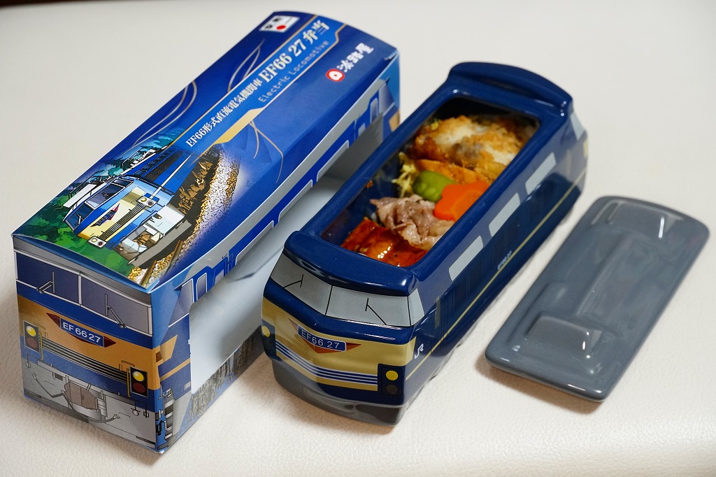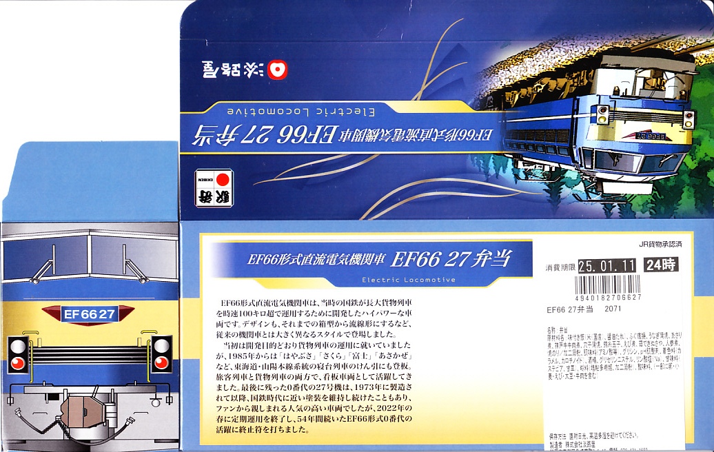 2025(令和7)年1月4日から調製元の店舗とオンラインショップで予約販売。これは同月の京王百貨店の駅弁大会で購入。2月からは各地のスーパーの駅弁催事や鉄道イベントでも販売。EF66形式電気機関車27号機の駅弁。よみがなはその主旨から「いーえふろくろく にーなべんとう」ではないかと思う。該当の電気機関車のイラストや解説を掲載した紙箱に、青い電気機関車型の陶器を収める。この容器に味付け飯を詰め、錦糸卵と刻み海苔で覆い、ふぐ唐揚げ、うなぎ蒲焼、あさり煮、神戸牛の牛肉煮、アナゴ蒲焼き、えび煮、ゆできぬさや、人参煮で埋める。この中身は公式サイトで「東京:深川飯、名古屋:うなぎ、神戸:神戸牛、広島:穴子、山口:ふぐ」と説明された。とても高価な駅弁なので、ニーナを愛する人のための商品。