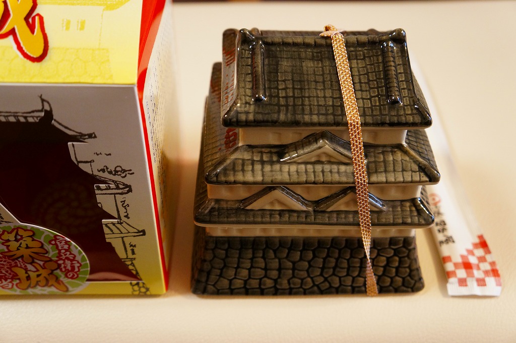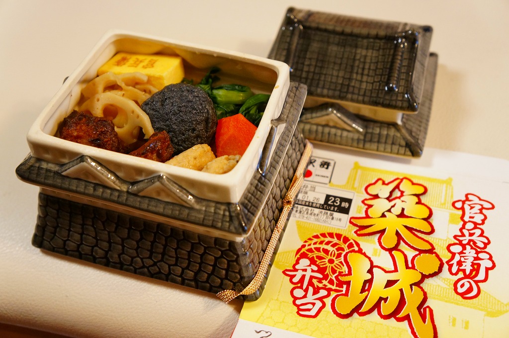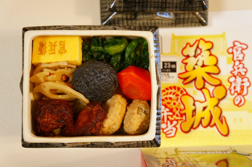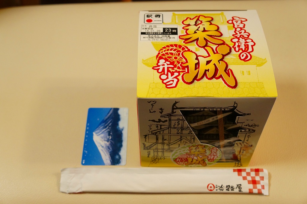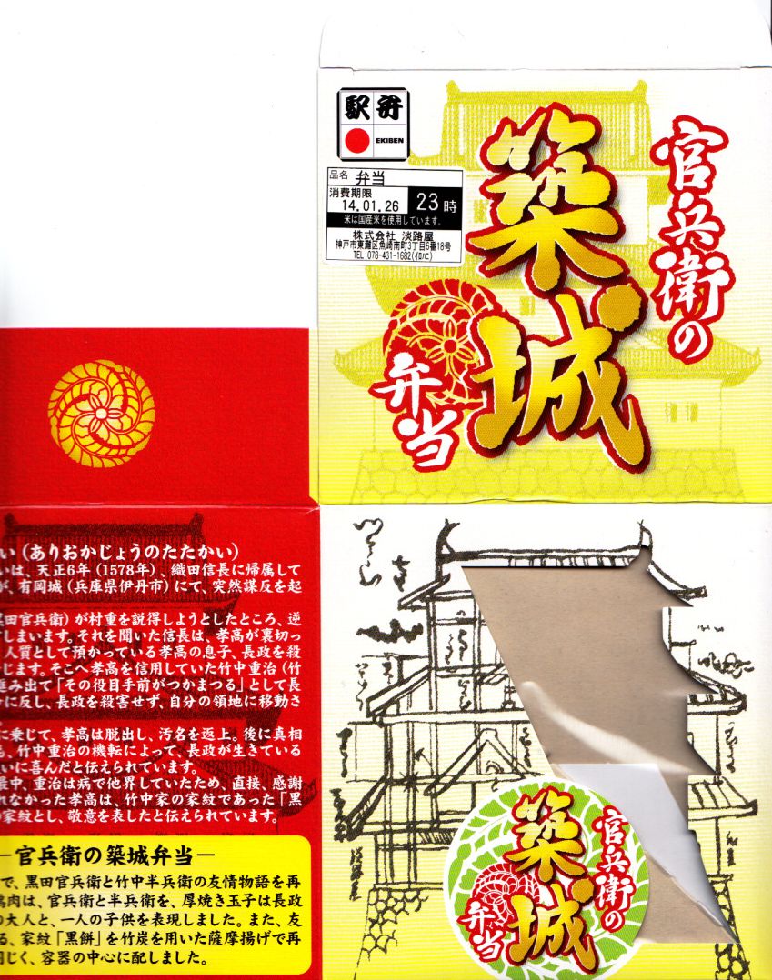 2014(平成26)年のNHK大河ドラマ「軍師官兵衛」にちなみ、2013(平成25)年12月27日に発売。姫路城の大天守を陶器で再現した容器は、10年前の姫路駅弁「一国一城」と同じ物ではないだろうか。この容器を収めるボール紙の箱で、官兵衛について細かく紹介。中身は炊込飯を鶏つみれ煮、「官兵衛」の焼き印入り玉子焼、鶏唐揚、揚げかまぼこ、きんぴらごぼう、菜の花、ニンジン煮で覆うもの。年末の大河ドラマの終わりを待たず、5月頃まで売られた模様。