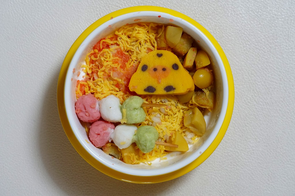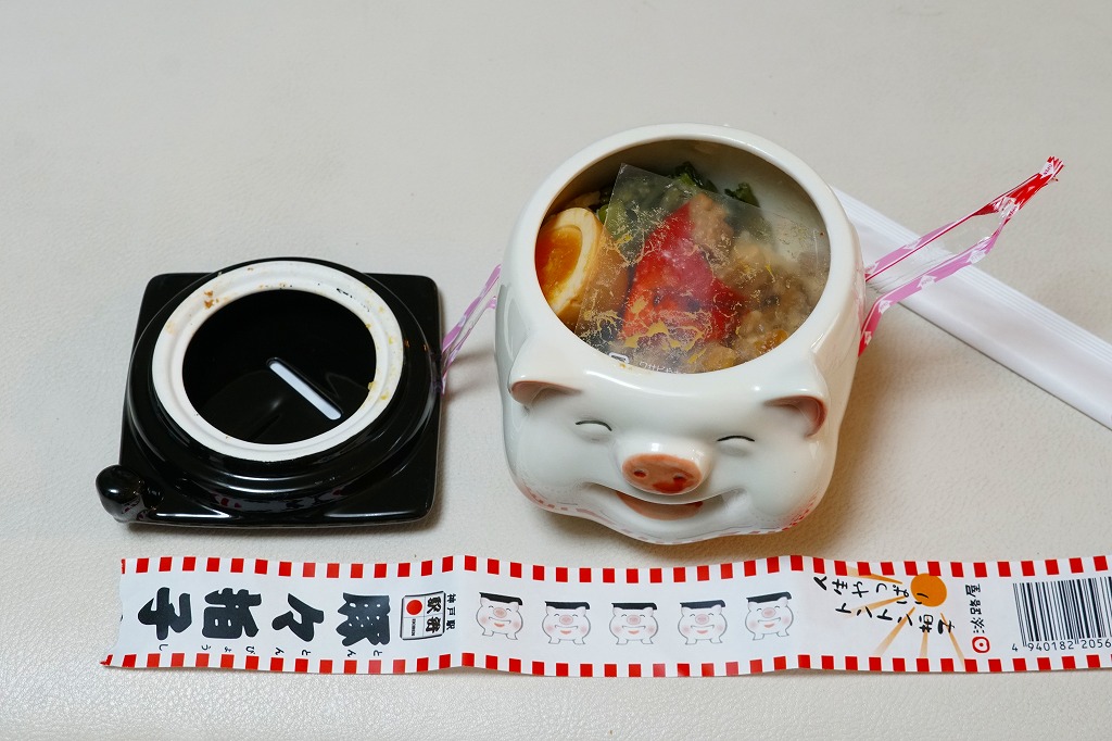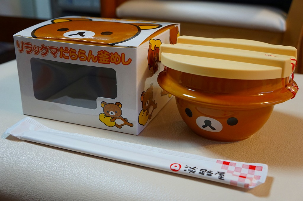 本体が陶製、ふたがプラ製の、駅弁にしても小柄な釜型容器に、きのこピラフを詰め、鶏うま煮で覆い、蒲鉾の三色団子2串とミニカステラを添える。コシのない食感と組合せのミスマッチでうまくないものの、容器や見た目で買われるキャラクター駅弁なので、これでよいのだろう。2019年までの販売か。2022年2月にオンラインショップで再販。