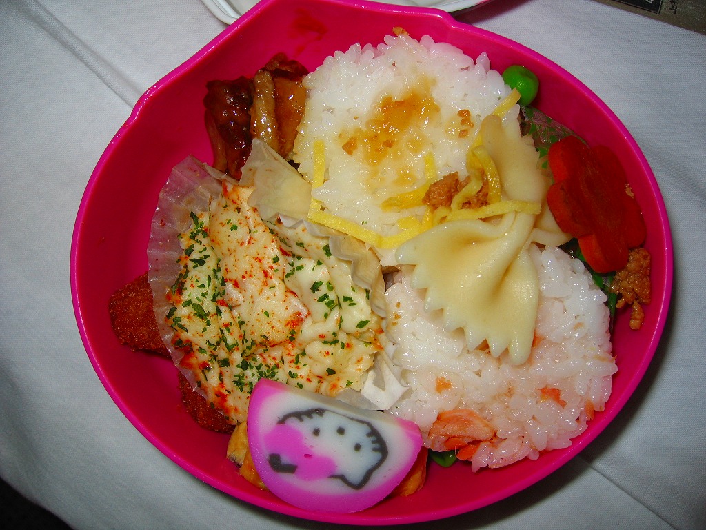 JR西日本のダイヤ改正に合わせて、2003(平成15)年10月1日に発売。宝塚歌劇団のスターに扮したキティちゃんを浮き出したプラスティック製容器を使用、中身は鮭とそぼろのおにぎりが1個ずつと、星形のコロッケに人参、キティちゃん柄の蒲鉾などが入り、見た目も中身もかわいらしい駅弁。発売当初で一日50個が販売された。2012年度限りで販売終了の模様。