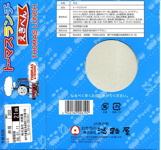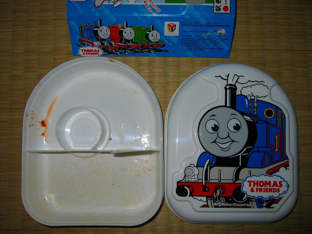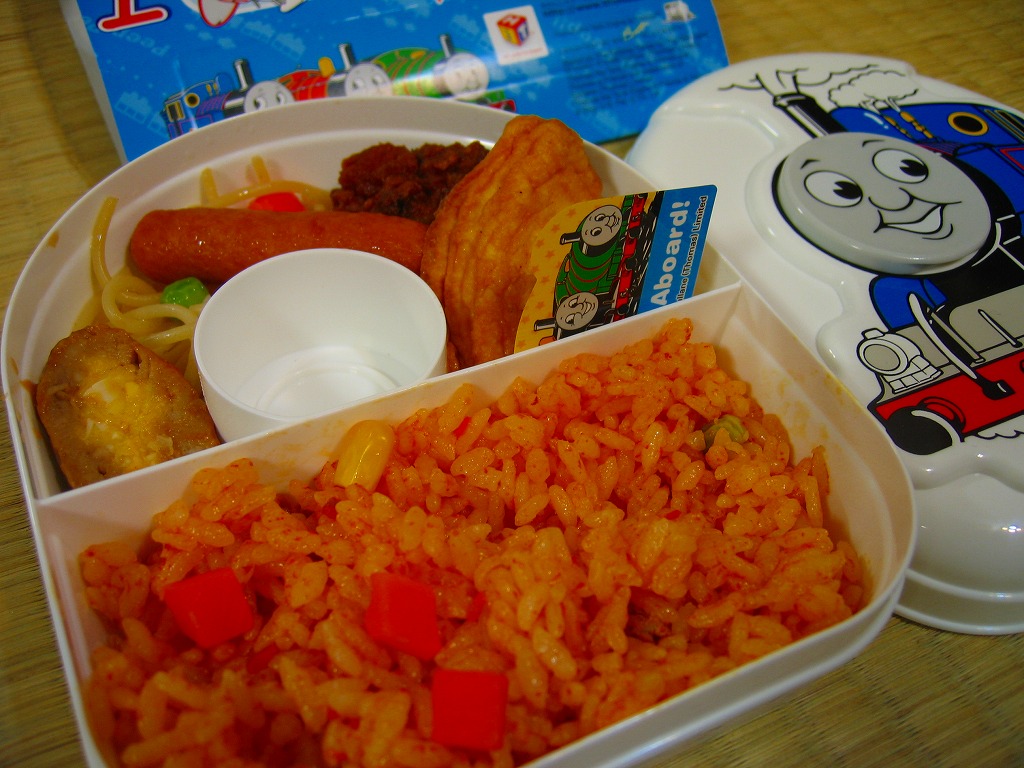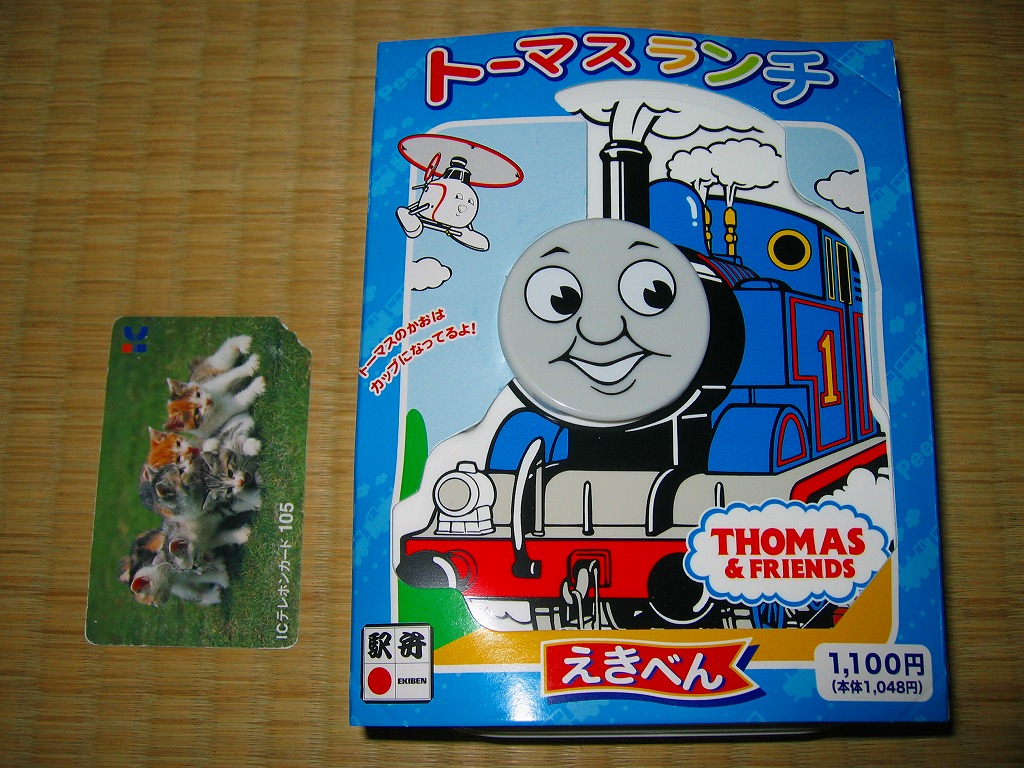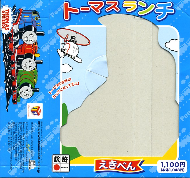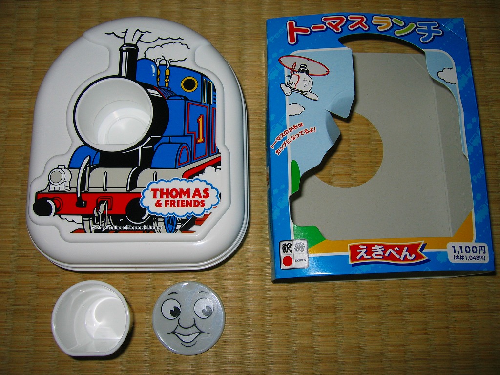 2008(平成20)年の秋に登場した、おそらく世界初のきかんしゃトーマス駅弁。その主人公であるトーマスのイラストを採用したプラスティック製の容器を、同じ絵柄のボール紙の枠にはめるのだが、顔の部分がパッケージから文字通り顔を出している。中身はチキンライスに鶏唐揚、オムレツ、スパゲティ、ウインナー、肉団子。容器も中身も楽しいお子様ランチ。