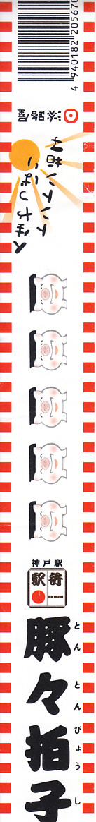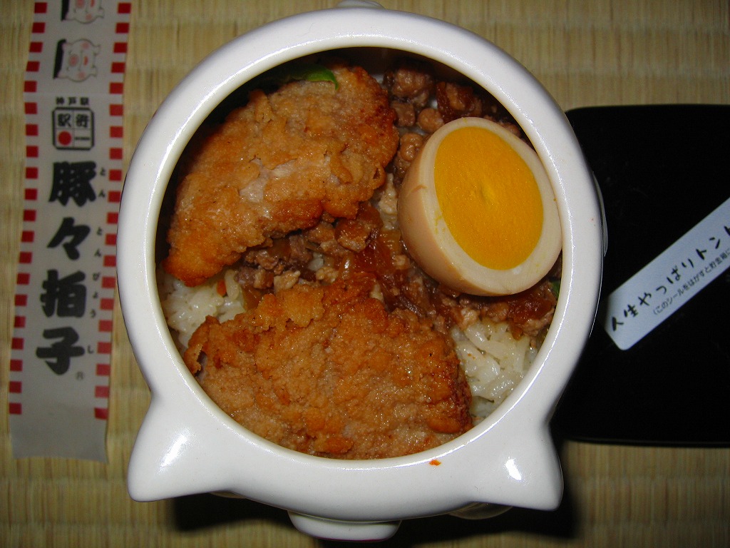 2004(平成16)年に発売された駅弁で、上記の駅弁「豚々拍子」の原典。当時の中身は排骨(パイクー)、魯肉(ルーロー)、東坡肉(トンポーロー)、麦飯、煮玉子などを詰めた台湾風弁当だった。サフランライスに、ちょっと脂っぽい揚げ豚と豚そぼろが載り豚角煮が隠れる、神戸駅弁の味。駅弁催事を中心に、2008年頃までの販売か。