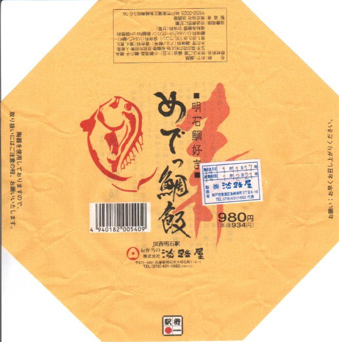 京王百貨店駅弁大会の第40回を記念して、2005(平成17)年1月に発売し、二週間で消滅。上の「めでっ鯛飯」とほぼ同型で色違いの陶製容器に掛紙をかけて紅白のゴムでしばる。中身は鯛の出し汁で炊いた御飯に鯛の身をまぶす、つまり「めでっ鯛飯」の小鯛酒蒸しが焼き鯛に変わっただけか。鯛味噌がチューブで付属。