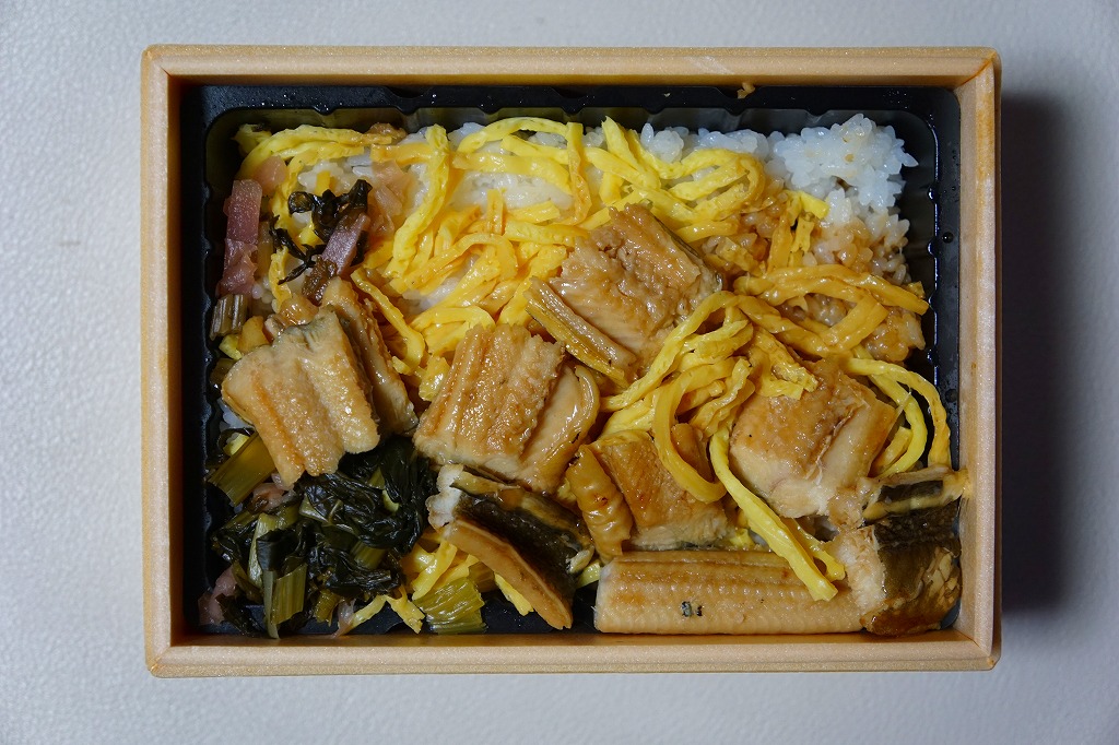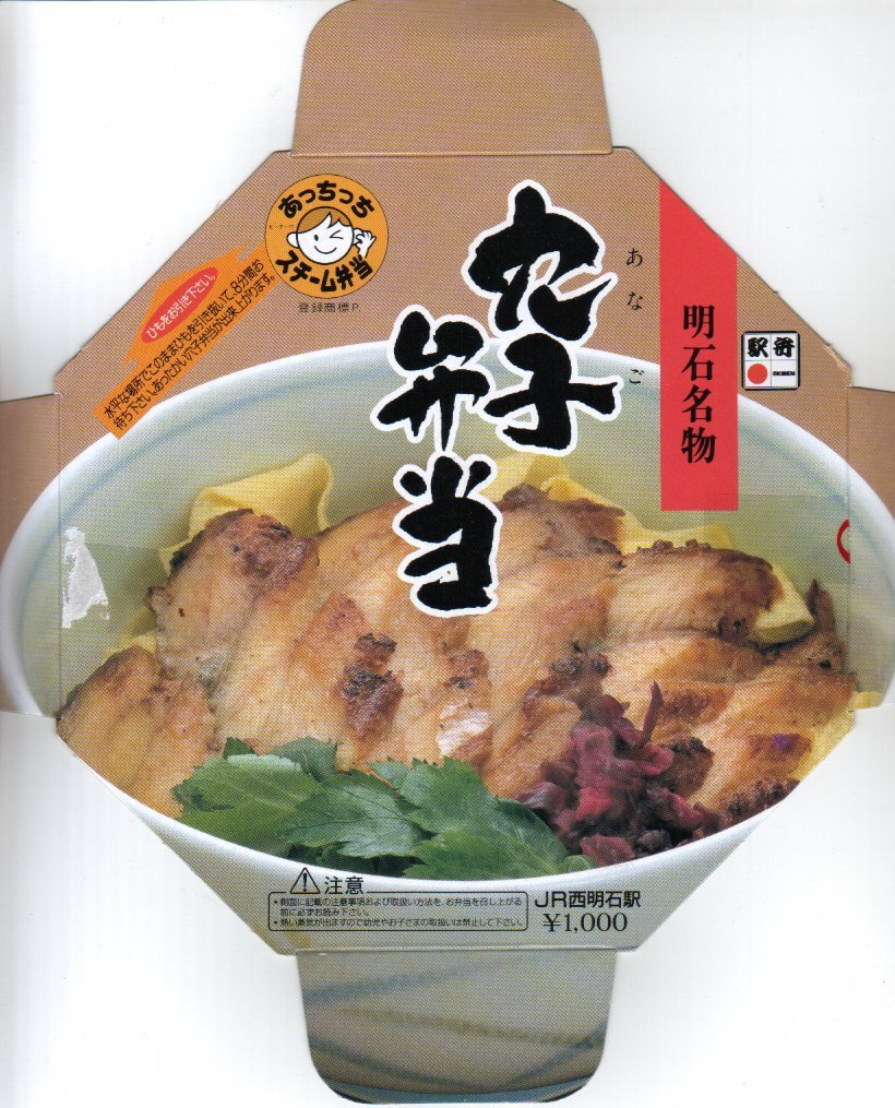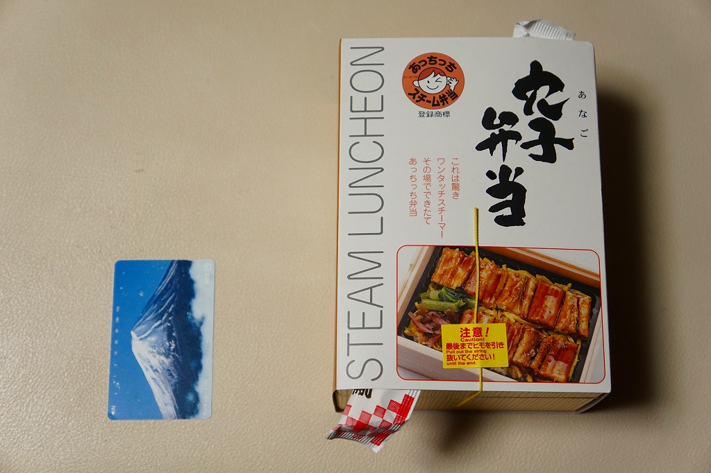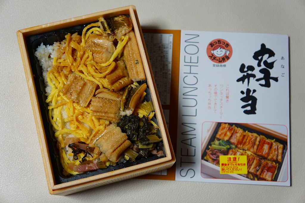 四角い加熱機能付き容器に白飯を詰め、焼きアナゴ、錦糸卵、小松菜のおひたし、かぶら醤油漬で覆う。今回購入のものは600kmの旅の結果か具が散らされているが、調製元の公式サイトの写真ではアナゴが整然と並べられている。神戸から本州各地に広まった加熱機能付き容器は、ここでは隙間なくコンパクトになっていた。2か月間ほどの販売か。