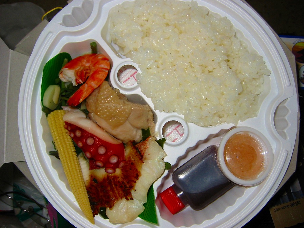3区画の中身は、白飯、蒸し鶏に煮ダコに焼アナゴにタイなどのおかず、もみじおろしとポン酢。当初の塩蒸しから酒蒸しに替えたという具に味付けがなく、そのまま食べれば駅弁らしくない薄味が温かく楽しめ、なかなかうまい。加熱式駅弁で具だくさんというのも珍しい。2007年頃までの販売か。