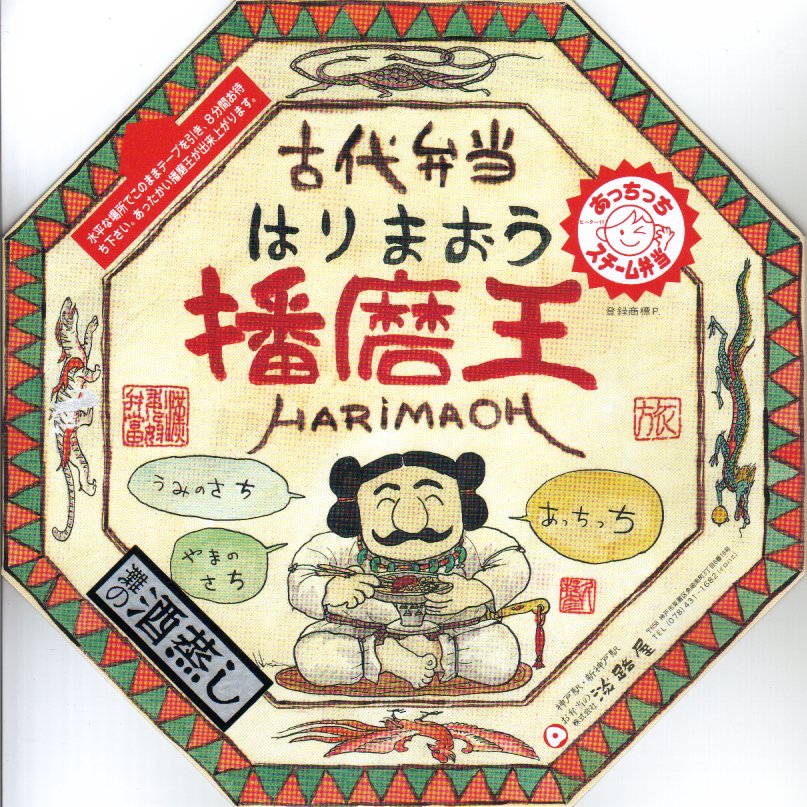 神戸の駅弁が誇る「あっちっち」シリーズの加熱機能付き容器を使用、ヒサクニヒコ氏による箱のイラストは、播磨王家の山幸姫に海幸彦や古代中国の四神を描いたという。