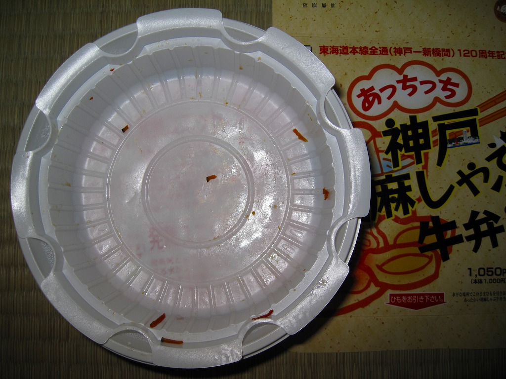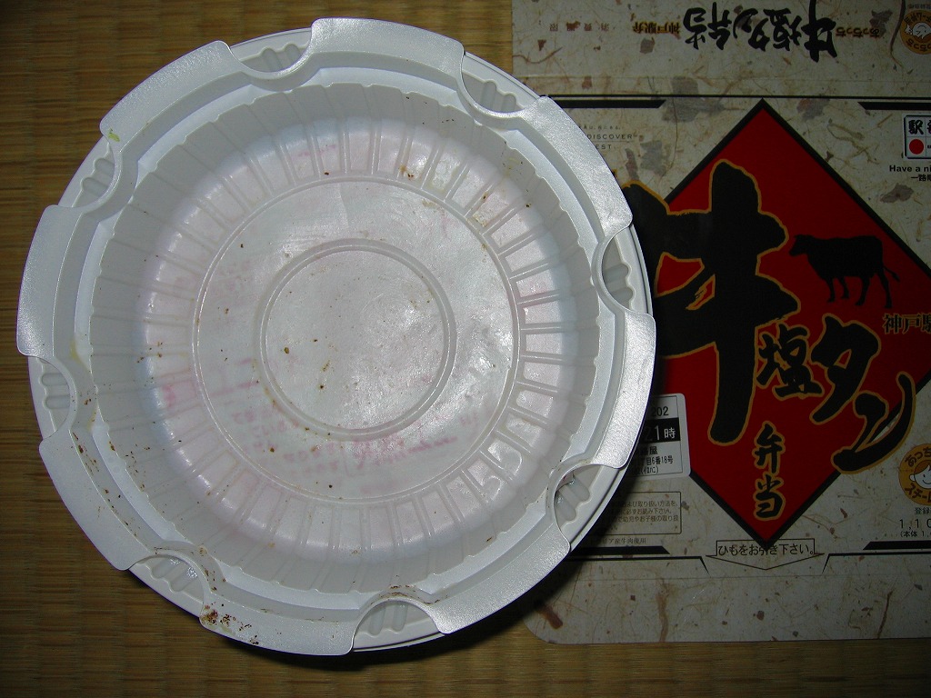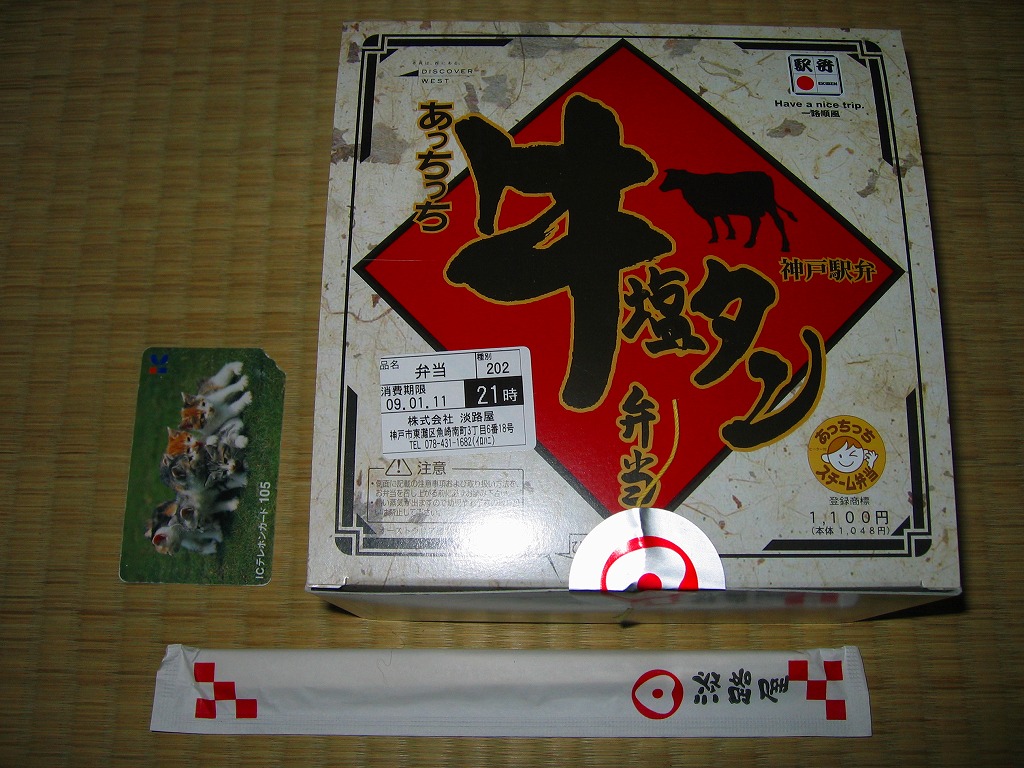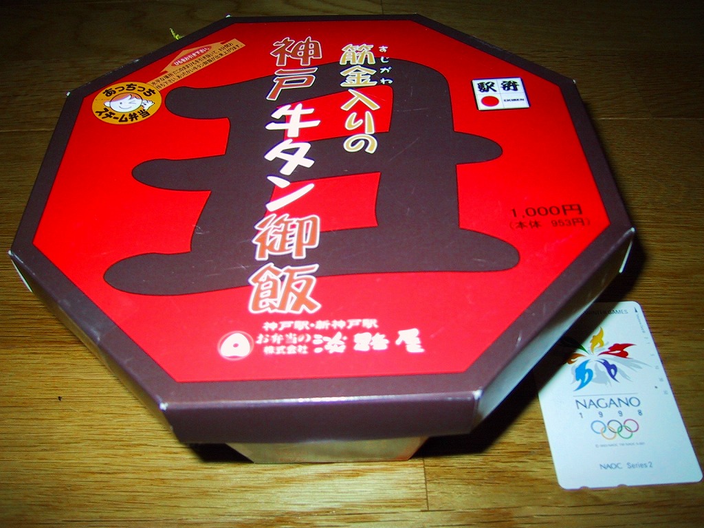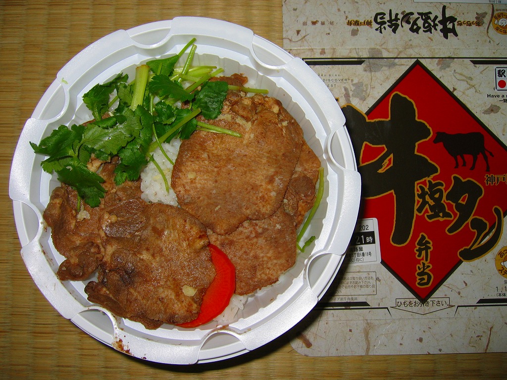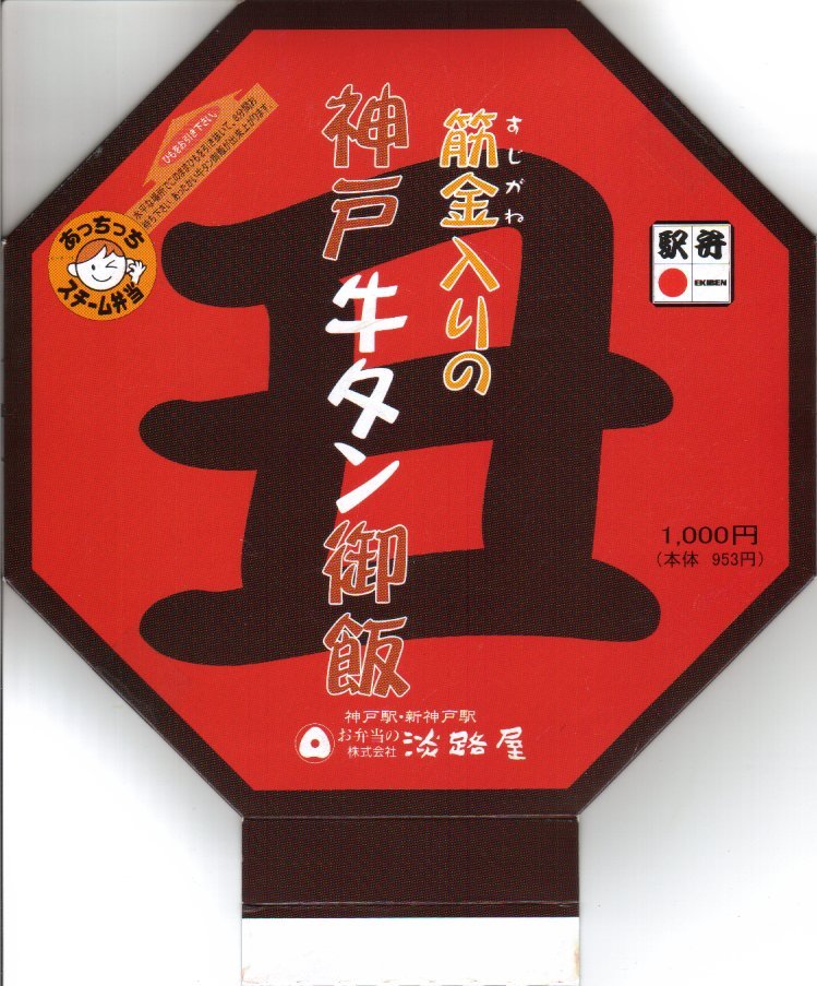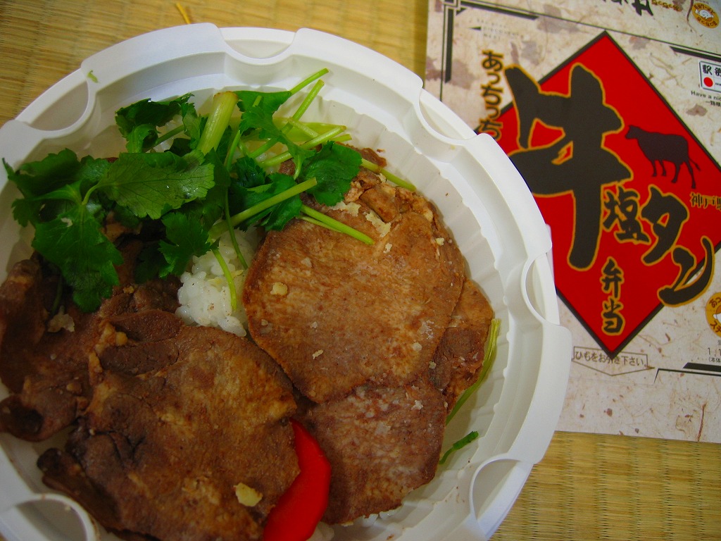 2007(平成19)年に発売か。円形の加熱機能付き容器を、駅弁の名前をデザインしたボール紙の箱に詰める。中身は白御飯の上に5〜6枚の牛塩タンを貼り付けて、ミツバとニンジンを添えたもの。塩とコショウと柴漬けを別添とした心遣いは、さすがの神戸駅弁。風味にも加熱式駅弁や牛肉駅弁に長ける調製元の実力が感じられる。食後感も良好、宣伝臭はほとんどなし。現在は販売されていない模様。
