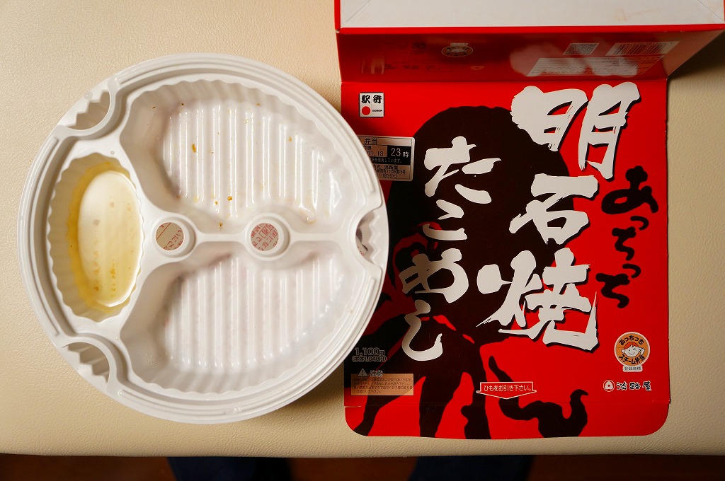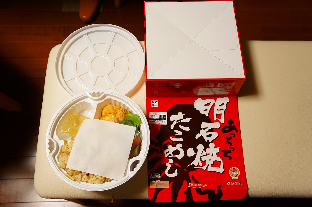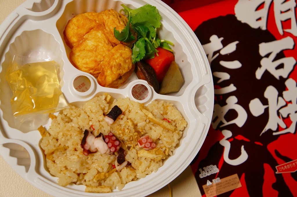 2012(平成24)年9月8日の発売。円形の加熱機能付き容器に、タコ飯、根菜の煮物と明石焼、出汁を詰める。ここの看板駅弁のひとつ「ひっぱりだこ飯」より軽い感じの柔らかいタコ飯も、過去に明石の市街で食べたものとほぼ同じ風味の明石焼も、心地良い感じ。価格は2013年の購入時で1,100円、2014年時点で1,080円。2014年までの販売か。