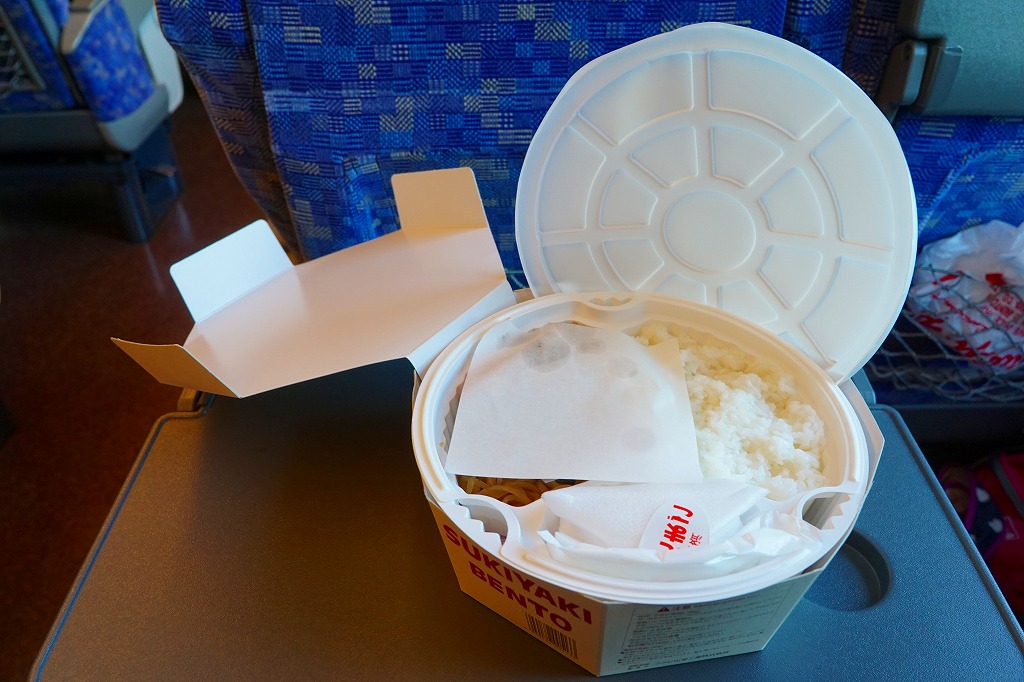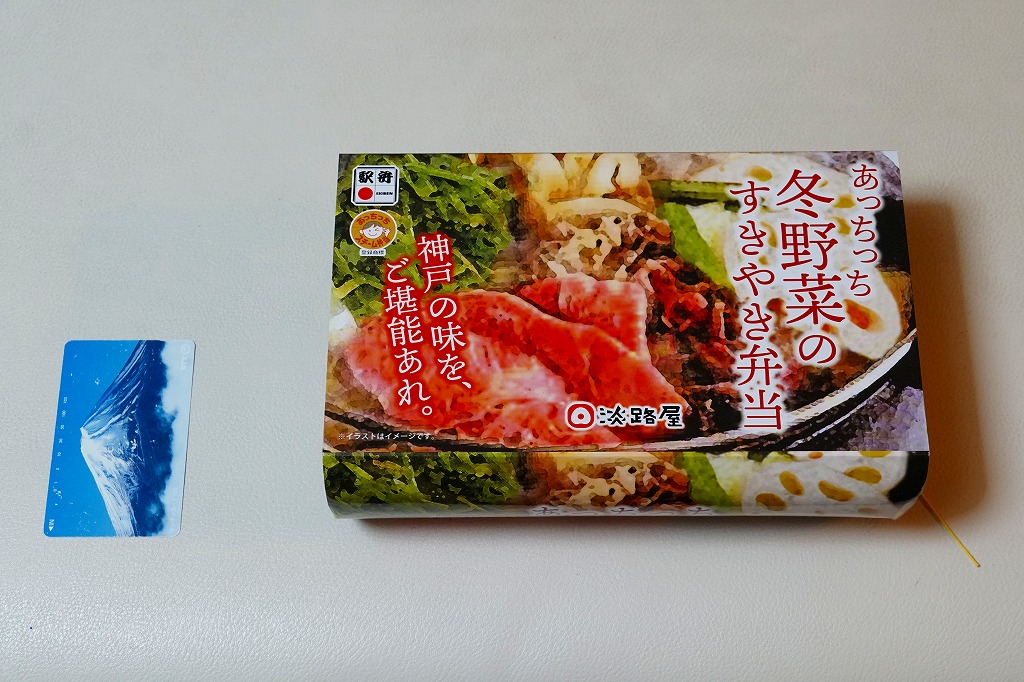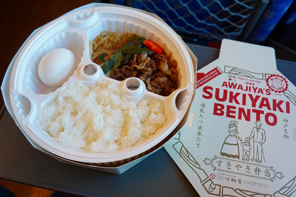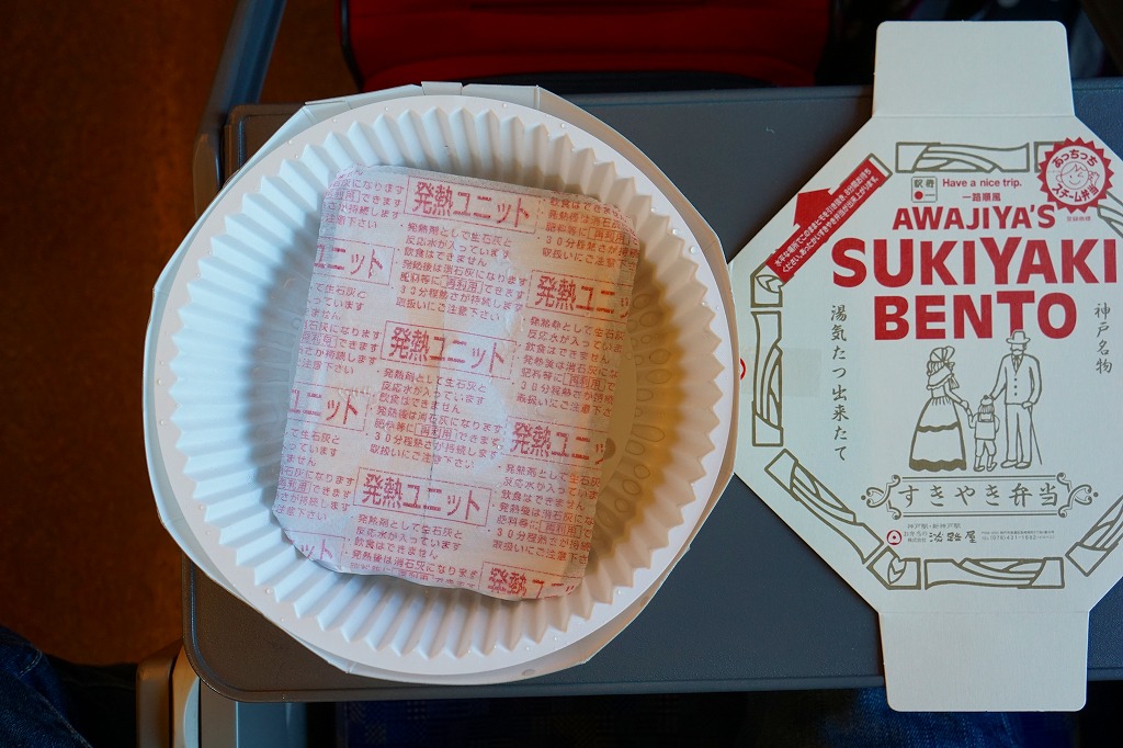 駅弁の名前は「あっちっちすきやき御飯」とも。パッケージの記述から、「のぞみ」新神戸駅停車を記念して2001(平成13)年10月に発売か。神戸の他の加熱機能付き容器駅弁でお馴染みの、八角形のパッケージに円形の容器を入れる。中身はわりしたで炊いた御飯の上に、兵庫県産和牛を使用したという牛すき焼きを載せるもの。つまり高級な牛丼ということで、温めればモリモリと食べられる。