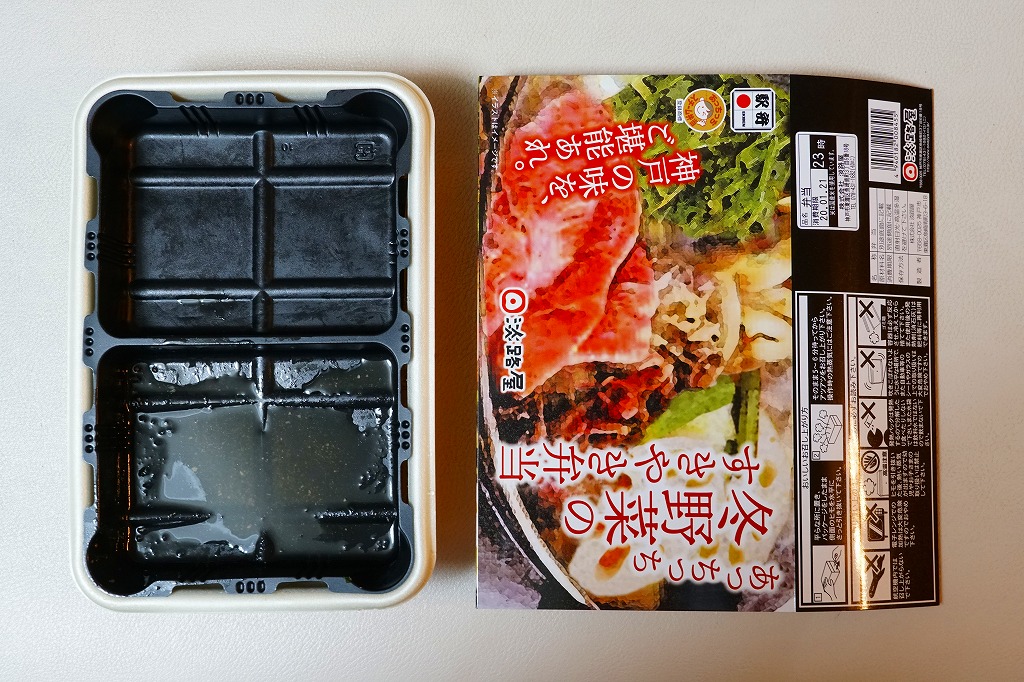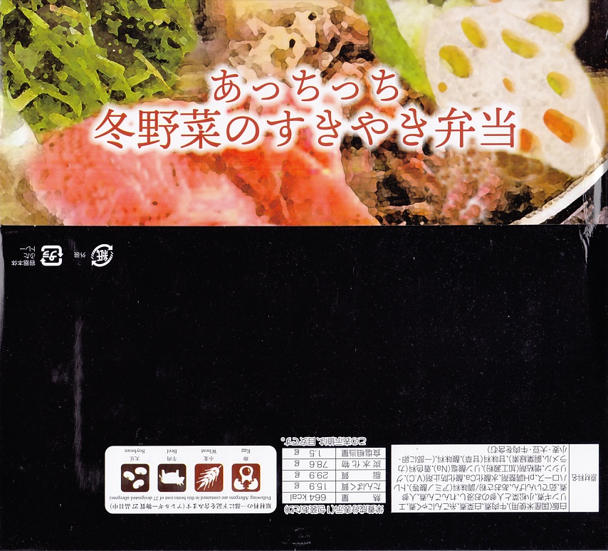 2019(令和元)年12月までに発売か。長方形の加熱機能付き容器の、半分に海苔をかけた御飯を、半分に牛肉や糸こんにゃくやエリンギや白菜やレンコンやニンジンなどのすき焼きを詰める。飯の量が多いため熱が足りないことと、肉が硬いことは仕様かどうか。2月か3月の頃には「春」に切り替わった。2021年春前に終売か。