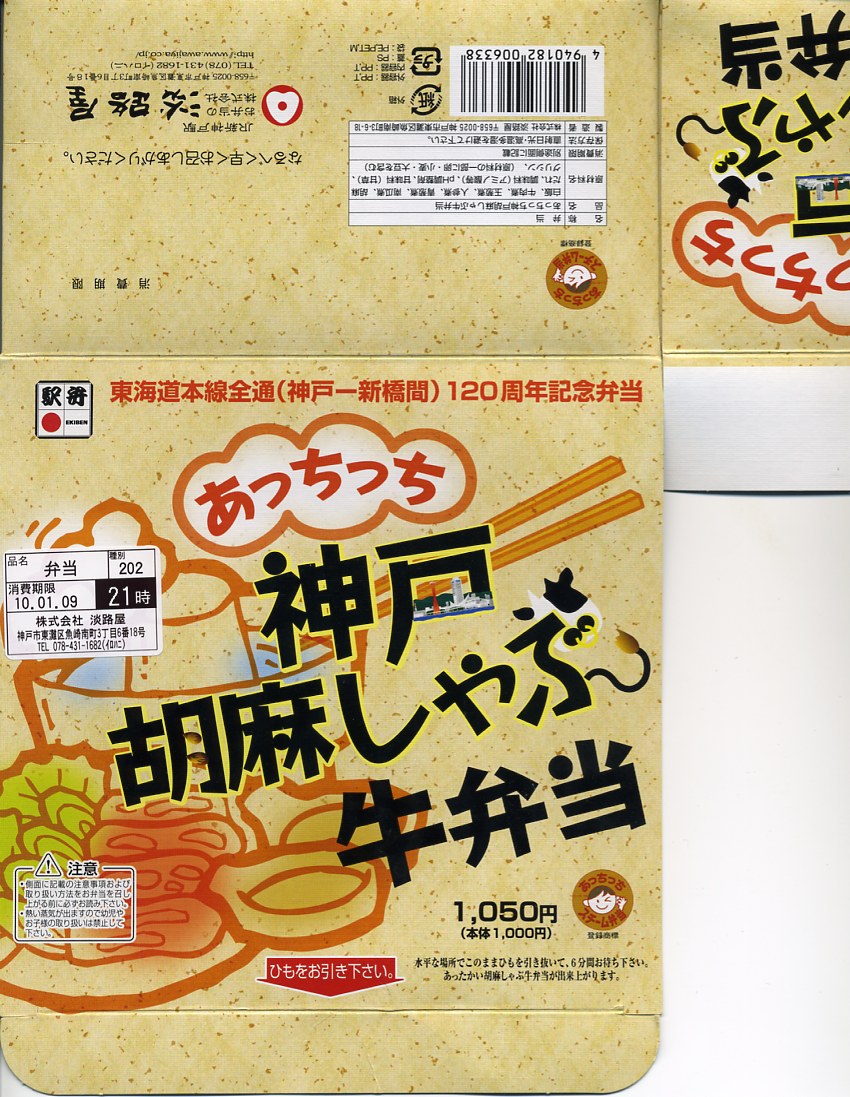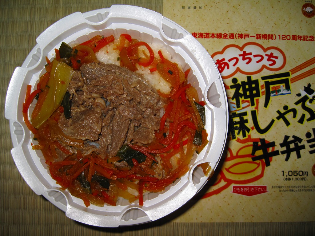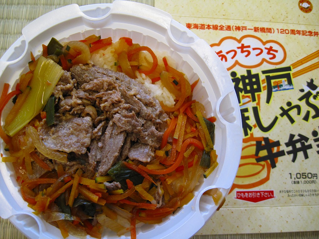 2010(平成22)年1月の京王百貨店の駅弁大会に向けた投入か。東海道本線全通(新橋−神戸間)120周年記念弁当の副題が付いている。円形の加熱機能付き容器を使用、駅弁の名前とそのイメージイラストを描いたボール紙の箱に詰める。中身は白御飯の上をタマネギと青ネギとニンジンの炒め物で覆い、牛肉煮を少々つまむもの。しゃぶしゃぶというより時雨煮のようになった牛肉の風味が、なんとなく残念。神戸で昭和の頃から定評のある常温版のしゃぶしゃぶ駅弁の面影は、こちらにはなかった。現在は販売されていない模様。
