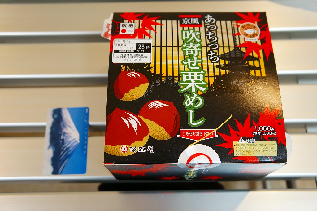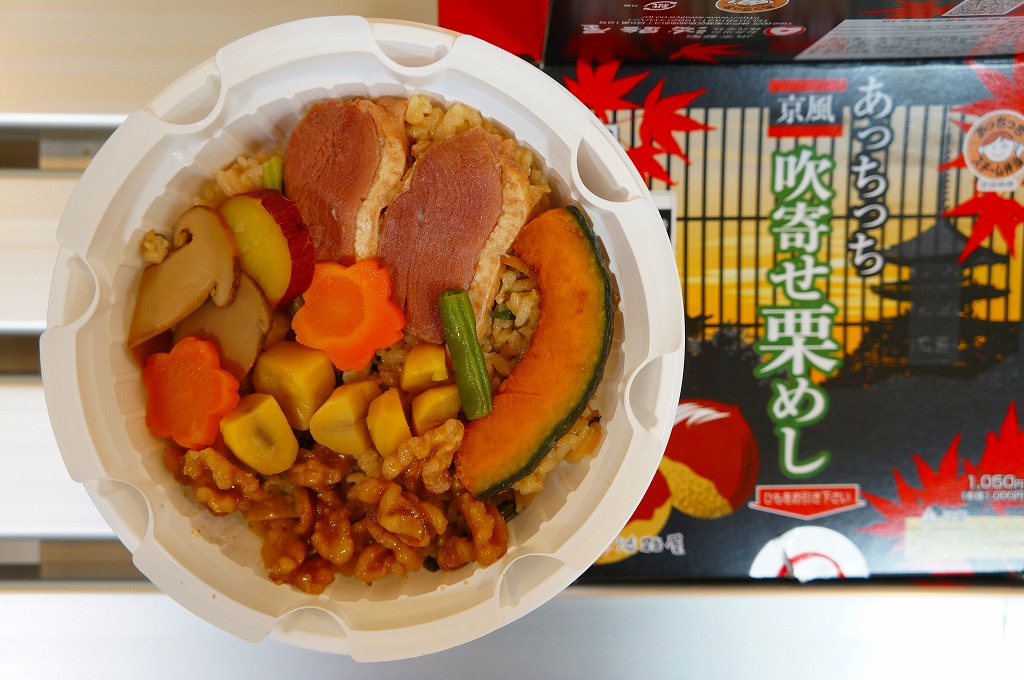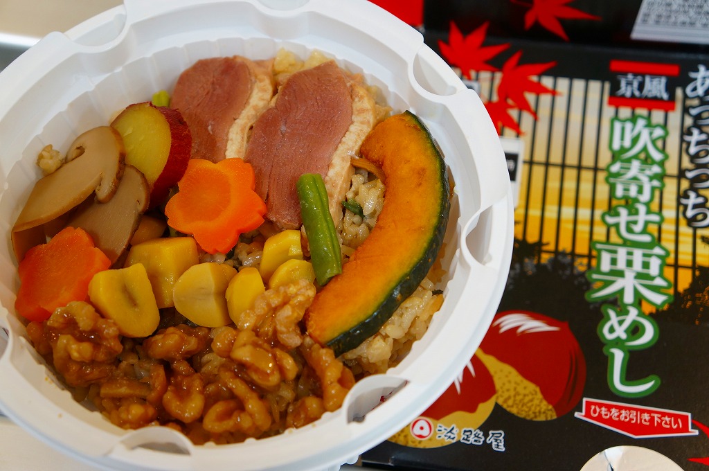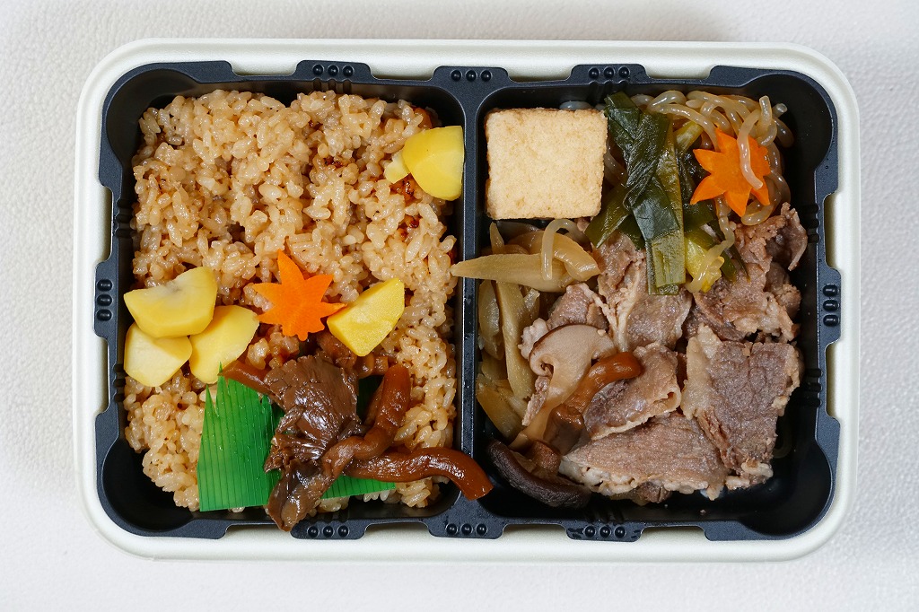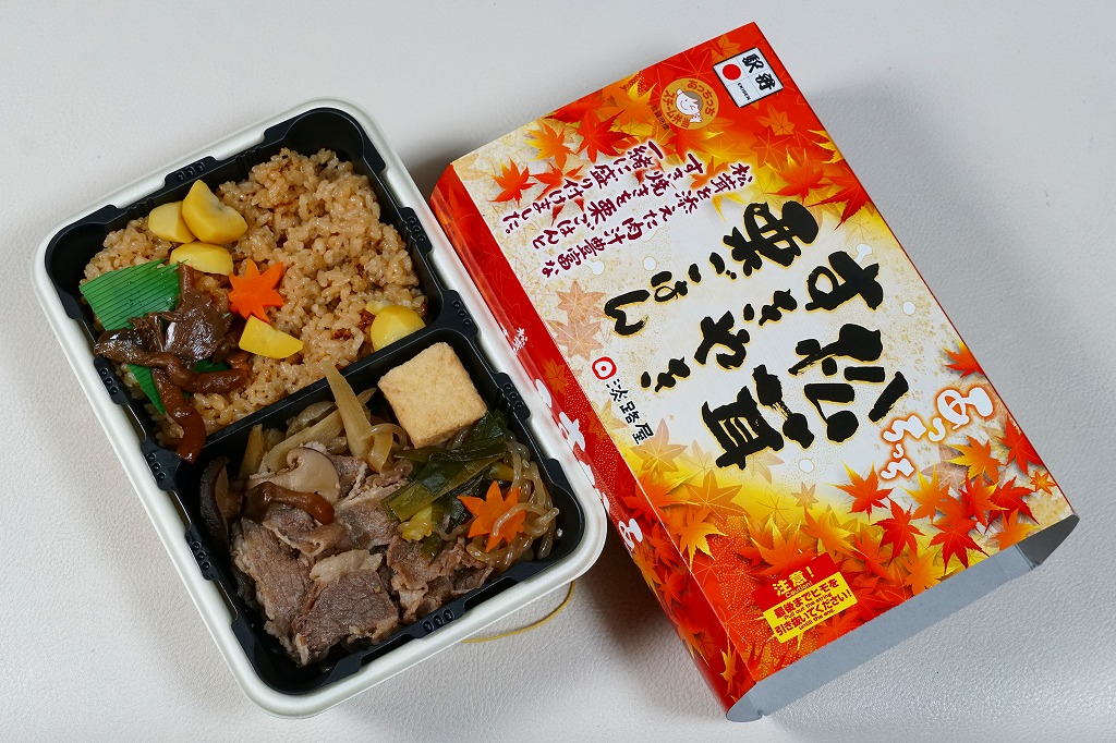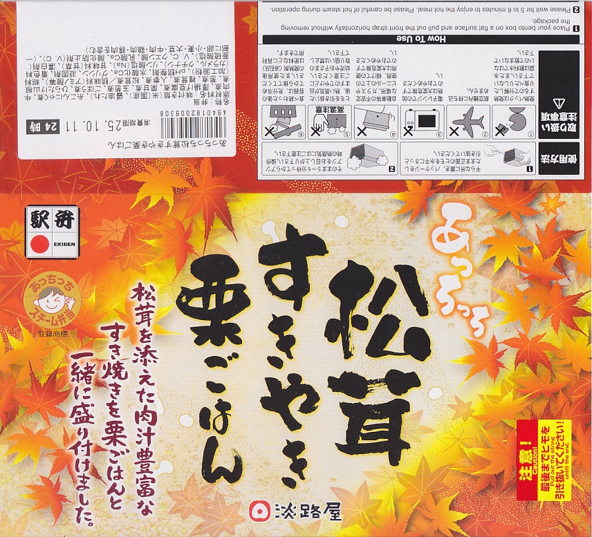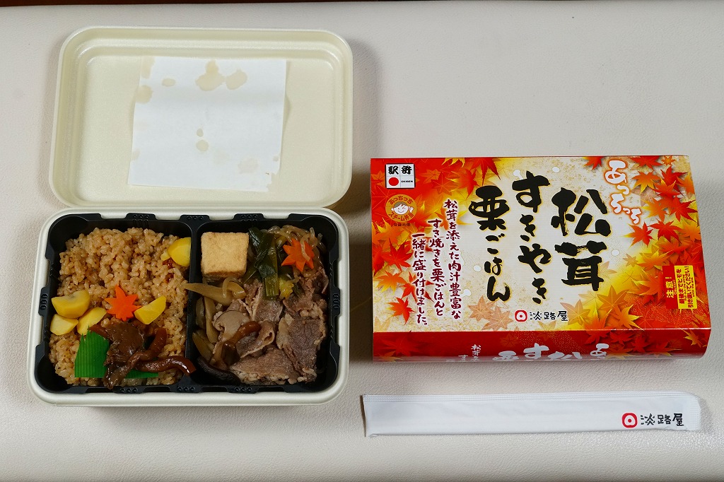 2018(平成30)年の9月に初めて販売か。秋季限定、もしかすると主に駅弁催事や通信販売で売られる商品かもしれない。四角い加熱機能付き容器の、2区画の両方に味付き飯を詰め、一方を牛肉や糸こんにゃくや厚揚げやマツタケなどで覆う「すきやき」、他方を栗やひらたけやニンジンなどで覆う「栗ごはん」とした。調製元が得意な容器と内容を備える、安定の味。紅葉が美しいスリーブが、売り場に秋をもたらす。価格は2021年時点で1,250円、2022年時点で1,420円、2025年時点で1,480円。